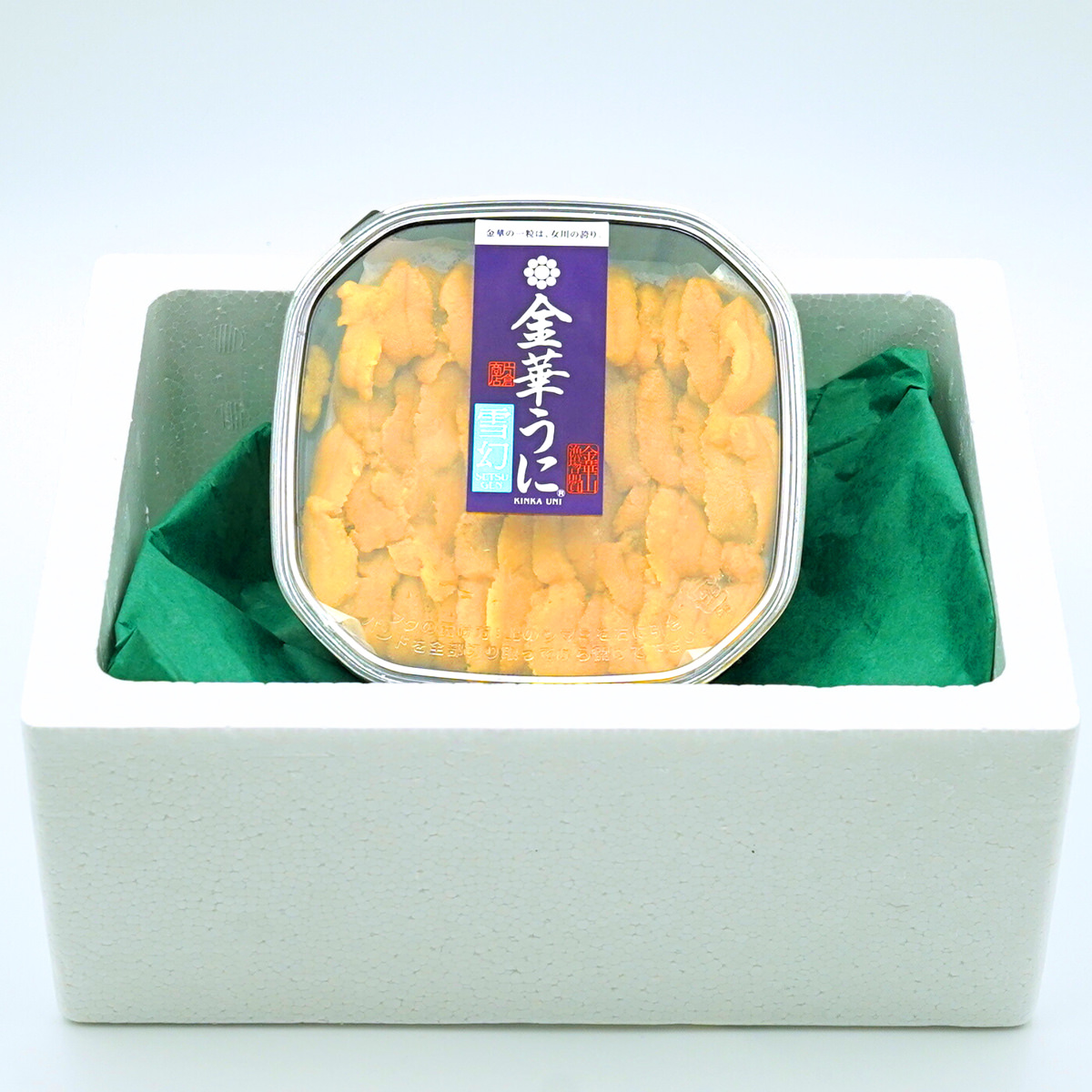 宮城県女川産のキタムラサキウニを原料に使用した「uoya 片倉商店 宮城県産 冷凍うに 金華うに 雪幻」です。金華うに雪幻(せつげん)は食品添加物無添加で仕上げており、嫌な臭いや味がありません。原料は片倉商店の潜水士が厳選して水揚げを行った、宮城県女川産100%です。冷凍品なので、お好きな時にいつでも生うにに近い味わいをお楽しみいただけます。容量は100gで、小ぶりのうに丼2人前の量に適しています。そのほか、軍艦巻き、手巻き寿司、お刺身、パスタ、炊き込みご飯などにもおすすめです。お召し上がりの前に冷蔵庫に移して解凍してください。解凍・開封後は当日中に食べ切るようにしてください。