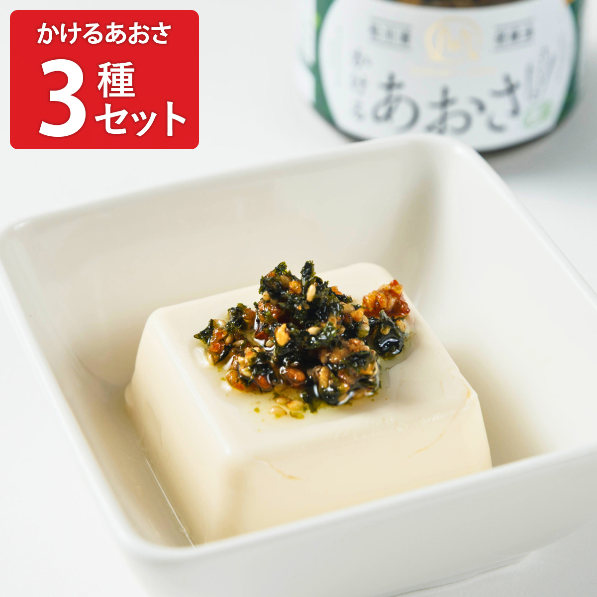 <ピリ辛松川浦かけるあおさ>食用なたね油(国内製造)、ごま、香味食用油(オリーブオイル、唐辛子)、フライドガーリック、フライドオニオン、ヒトエグサ、食塩、砂糖、にんにく、粉末しょうゆ、ハラペーニョパウダー、香辛料、チキンエキス、ポークエキス、食用風味油、たん白加水分解物、ゼラチン/調味料(アミノ酸等)、酸化防止剤(ビタミンE)、pH調整剤、(一部に小麦・大豆・ごま・鶏肉・豚肉・牛肉・ゼラチンを含む)