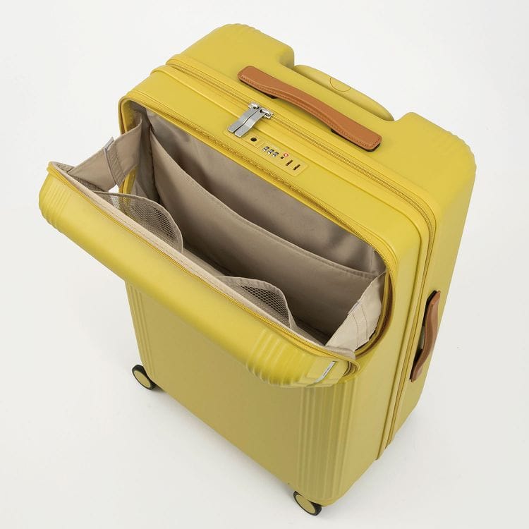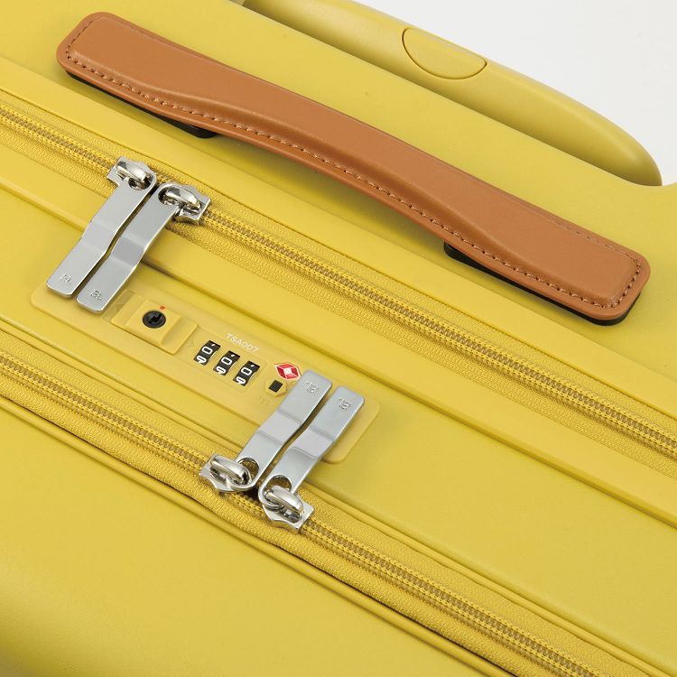シンプルなデザインに、本革製のハンドルで高級感をプラスしたジッパーオープンのスーツケース。