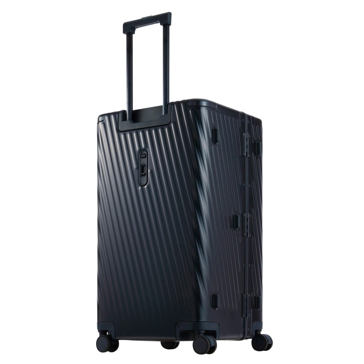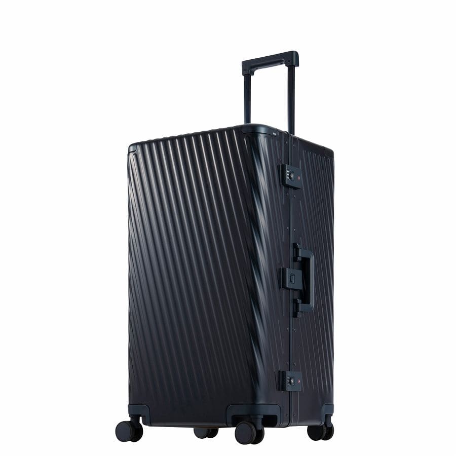 斜めのリブが美しくフェードアウトするアルミニウムボディのスーツケース。