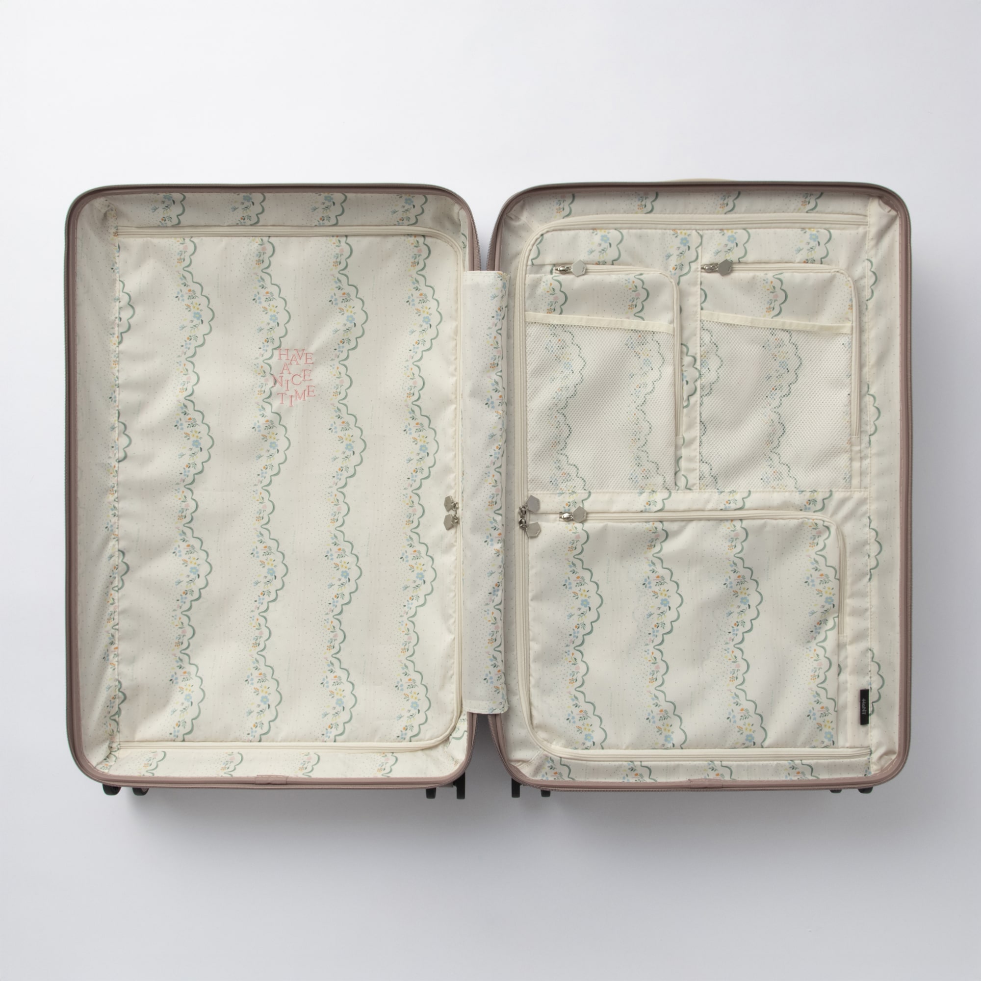 可愛いロゴ刺繍入りの中仕切りが付いているので、空港やホテルなどで開けても中身が見えず安心です。