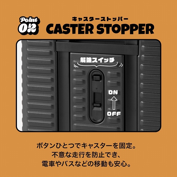 電車やバス、傾斜などで不意な走行を防ぐキャスターストッパーを搭載。