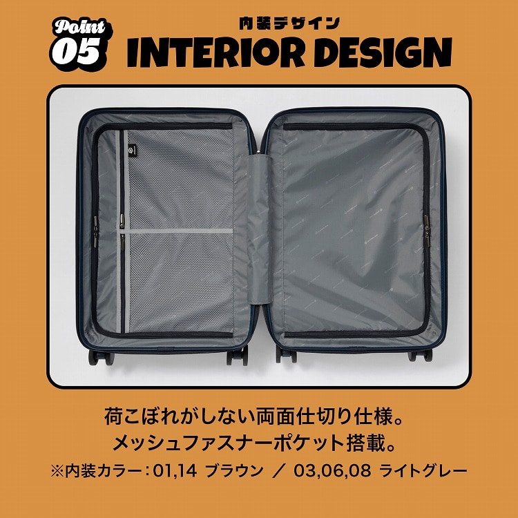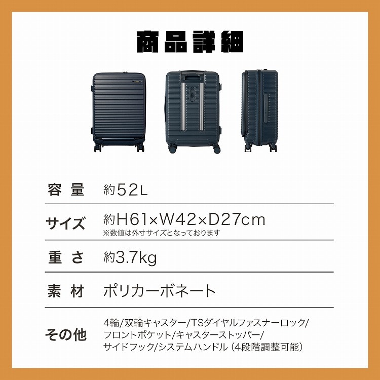 | 機能一覧 | 機内預け入れ/4輪/双輪キャスター/TSダイヤルファスナーロック/フロントオープン/キャスターストッパー/サイドフック |