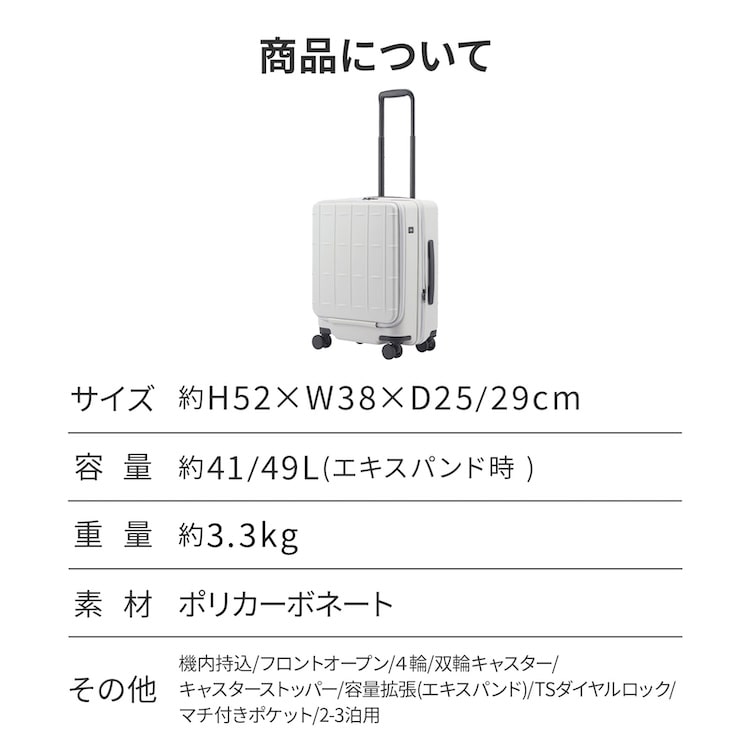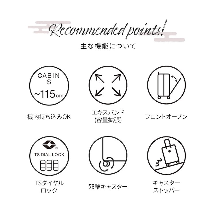 | 機能一覧 | 4輪(双輪・静音タイプ)/TSダイヤルファスナーロック/キャスターストッパー/フロントオープン式/エキスパンダブル/国内100席以上・国際機内持込み |