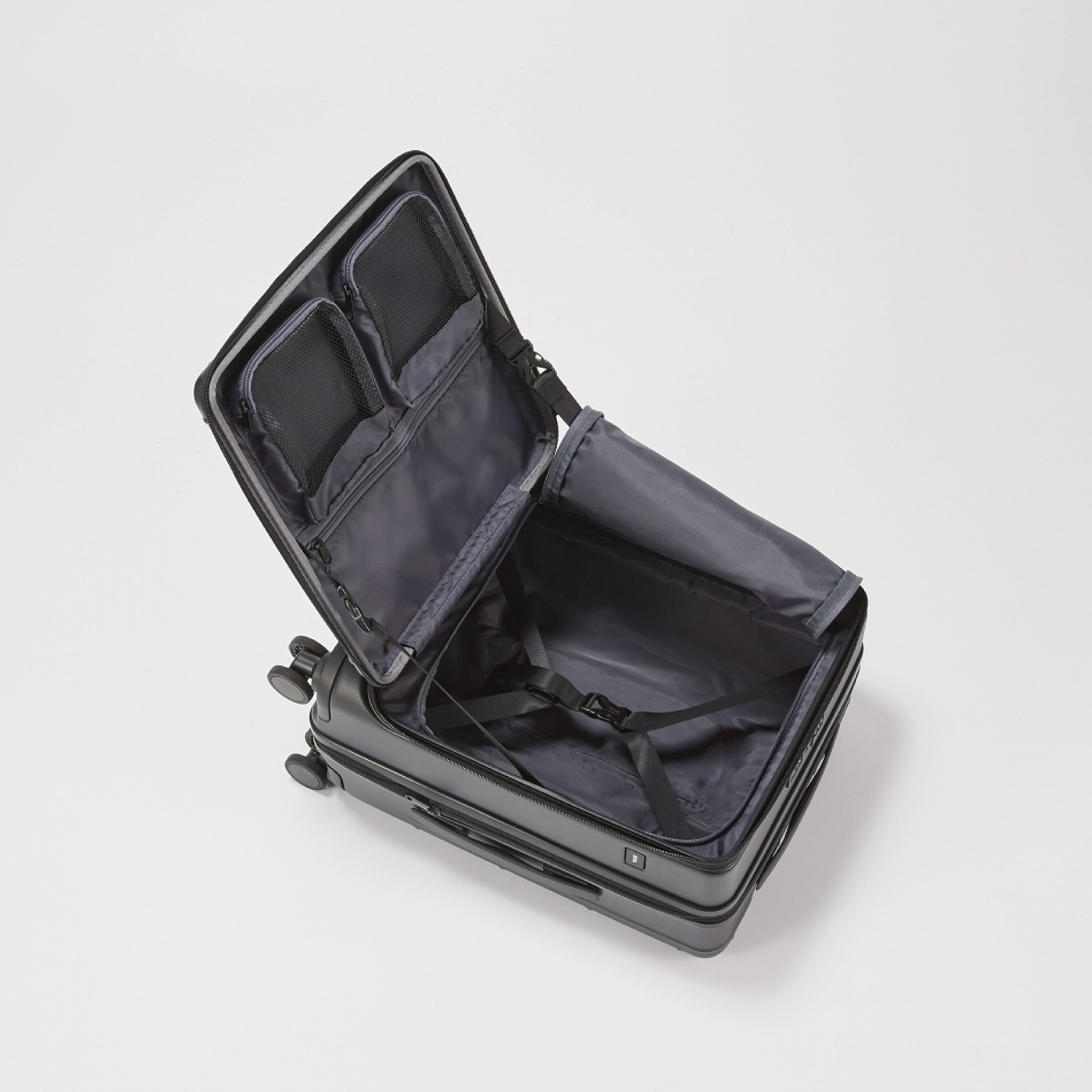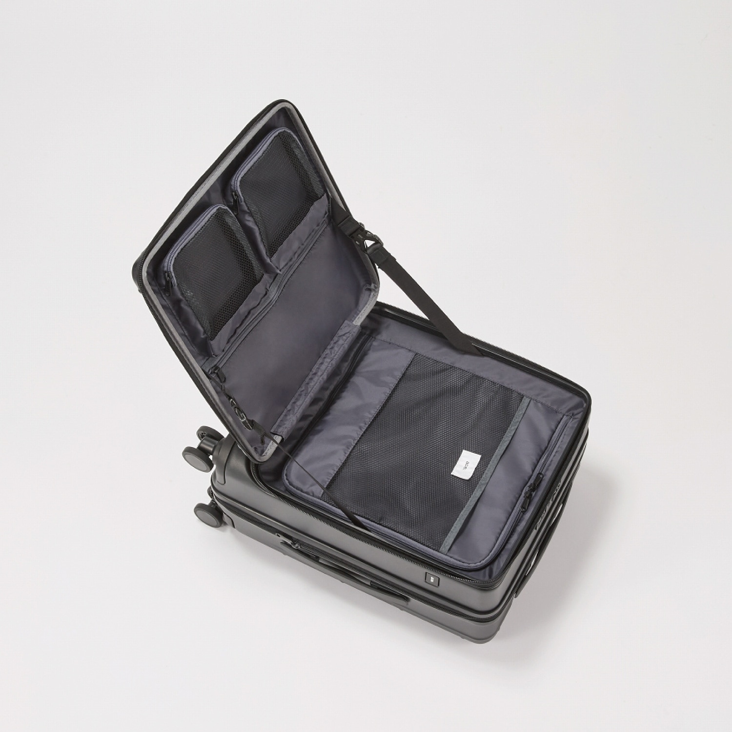 小分けに収納できる視認性の高いメッシュ生地のポケットや、上着やお土産などをクイックに収納できるポケットを搭載。