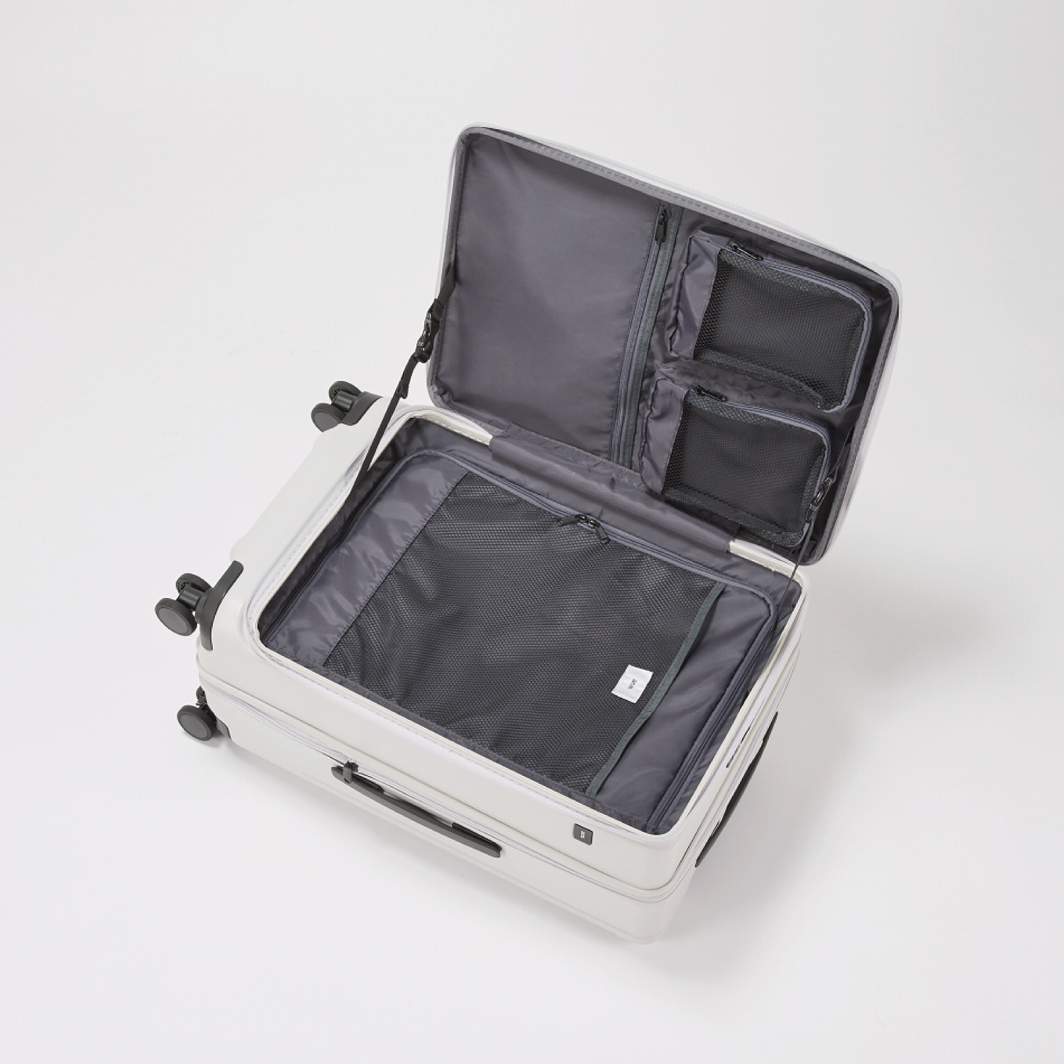 小分けに収納できる視認性の高いメッシュ生地のポケットや、上着やお土産などをクイックに収納できるポケットを搭載。