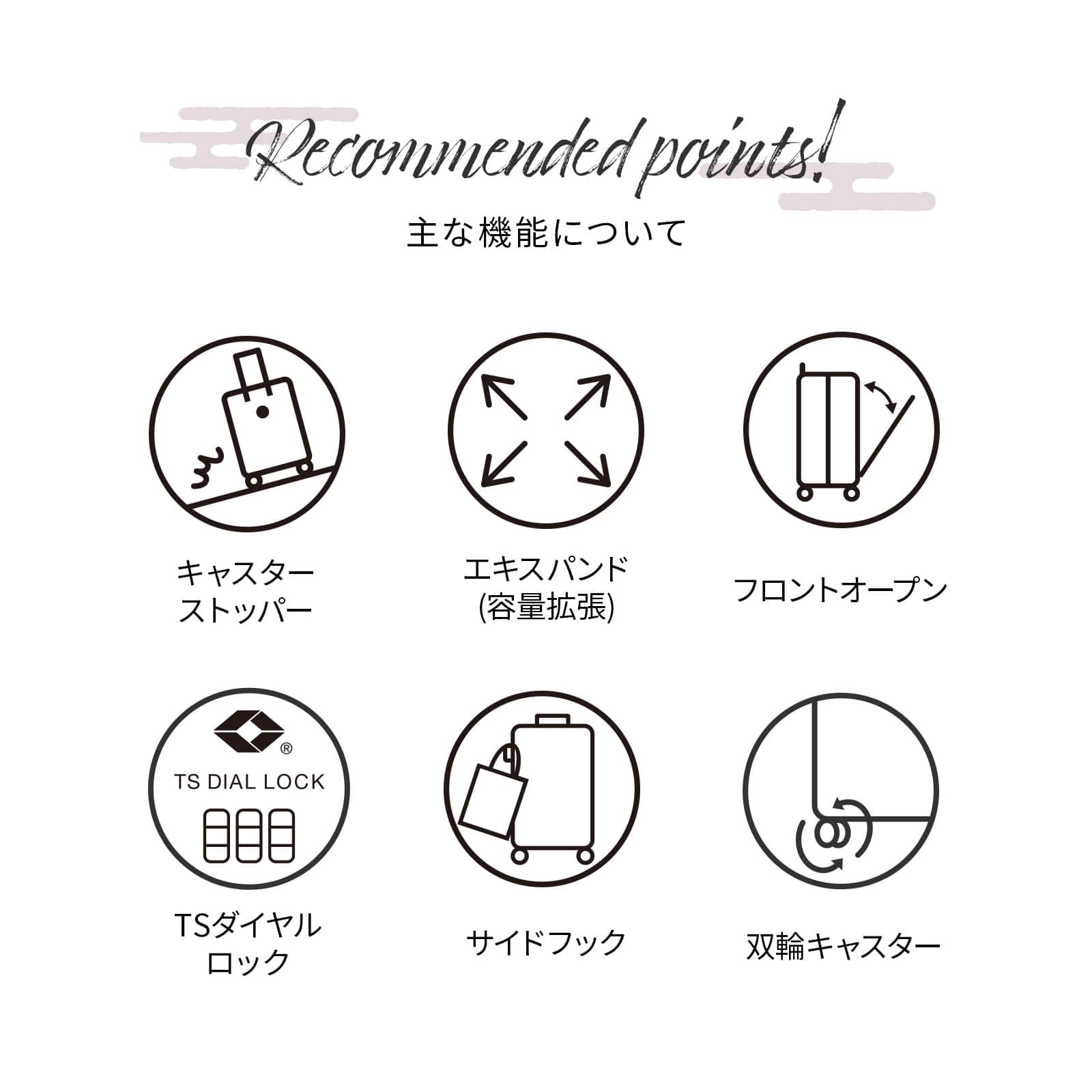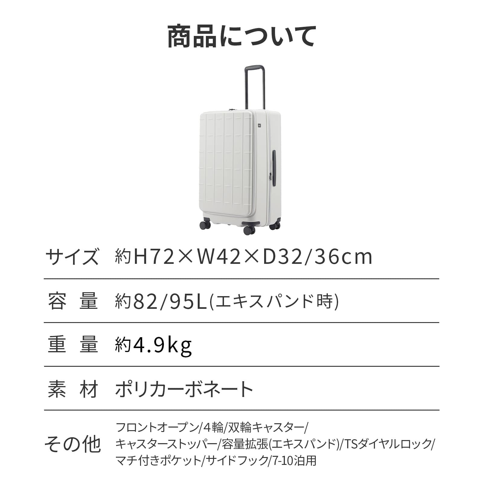| 機能一覧 | 4輪(双輪・静音タイプ)/TSダイヤルファスナーロック/キャスターストッパー/フロントオープン式/エキスパンダブル/機内預け入れサイズ |