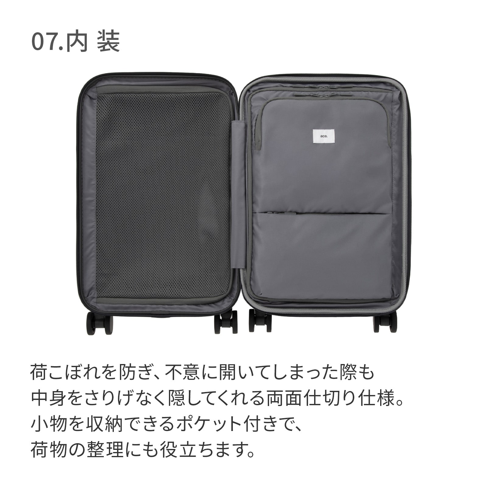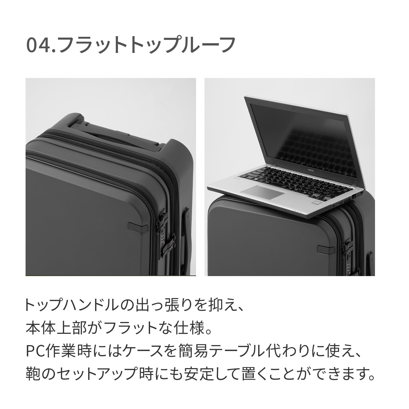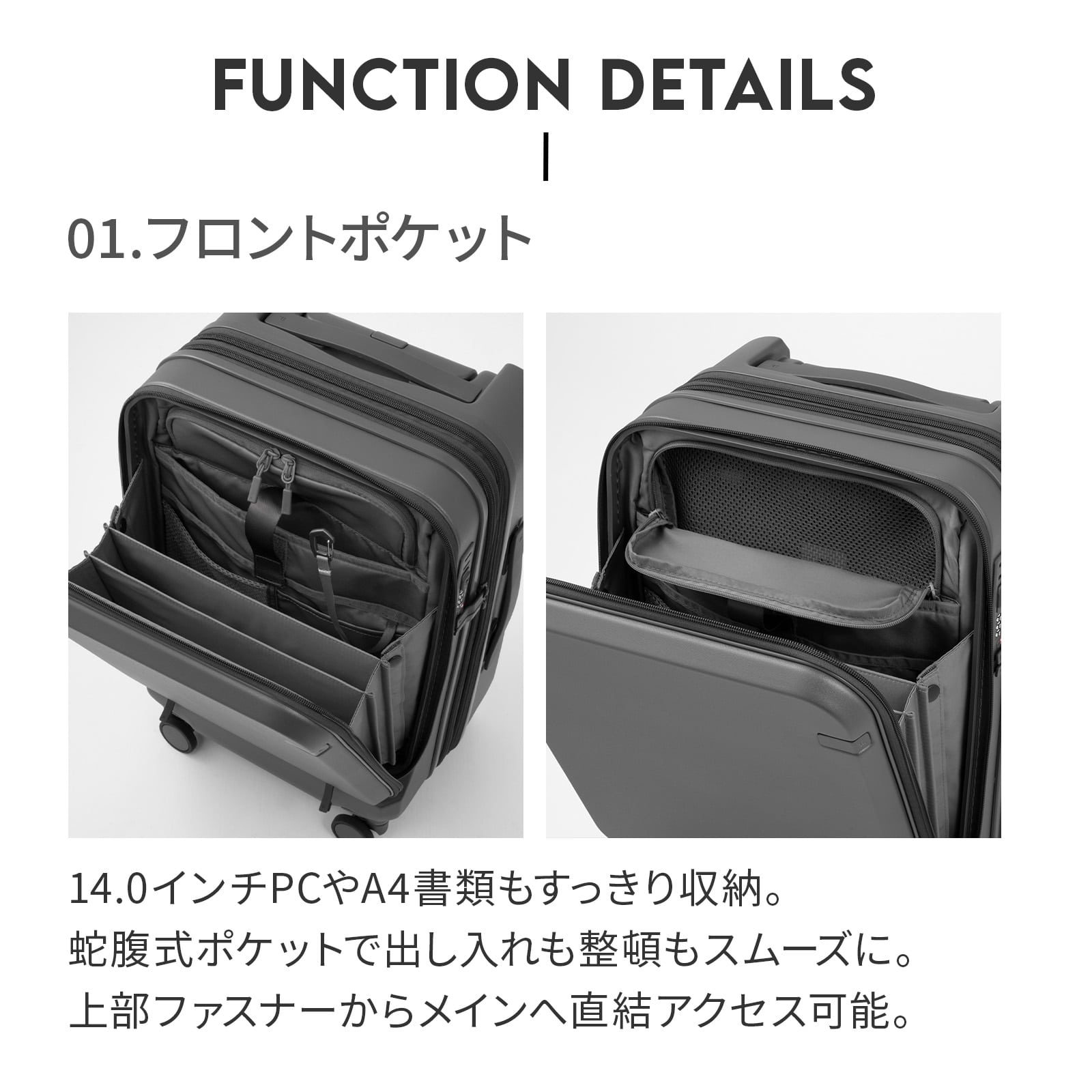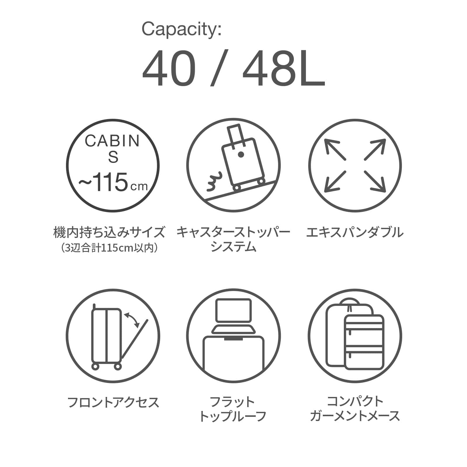 | 機能一覧 | 4輪(双輪)/TSダイヤルファスナーロック/キャスターストッパー/フロントオープンポケット(メイン気室へのアクセスは不可)/エキスパンダブル/コンパクトガーメントケース・オーガナイザーパネル付属/国内100席以上・国際機内持込み |
