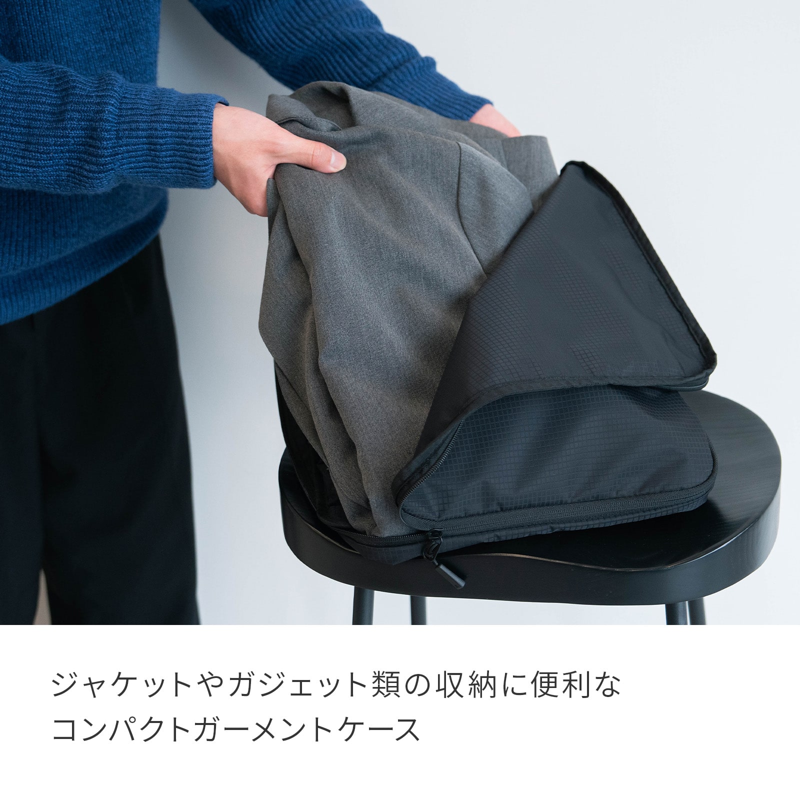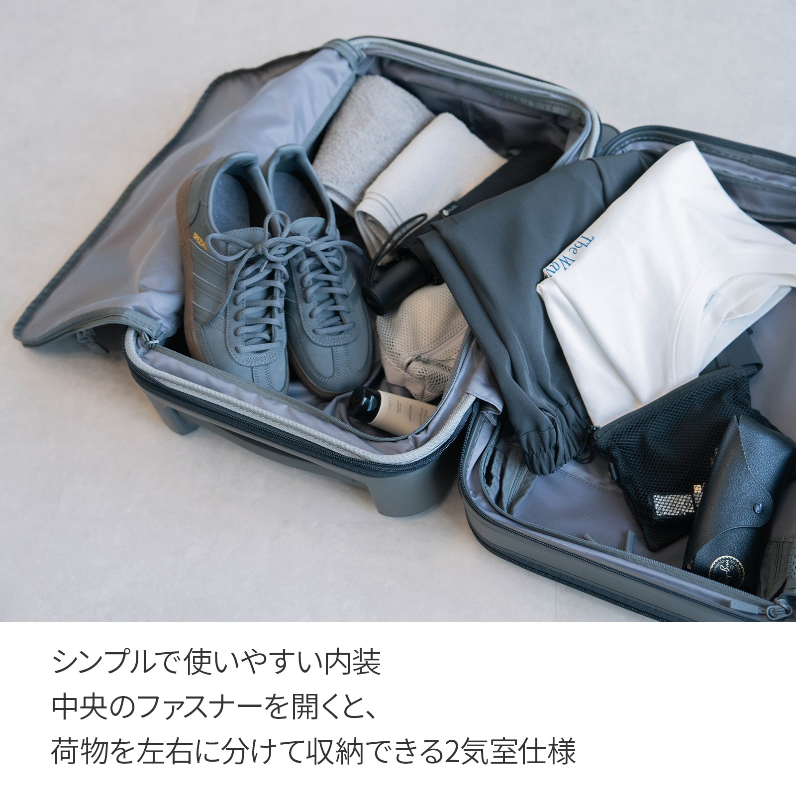 双輪キャスターやエキスパンダブル機能に加え、衣類の仕分けができるオーガナイザーパネル入りのコンパクトガーメントケースが付属。