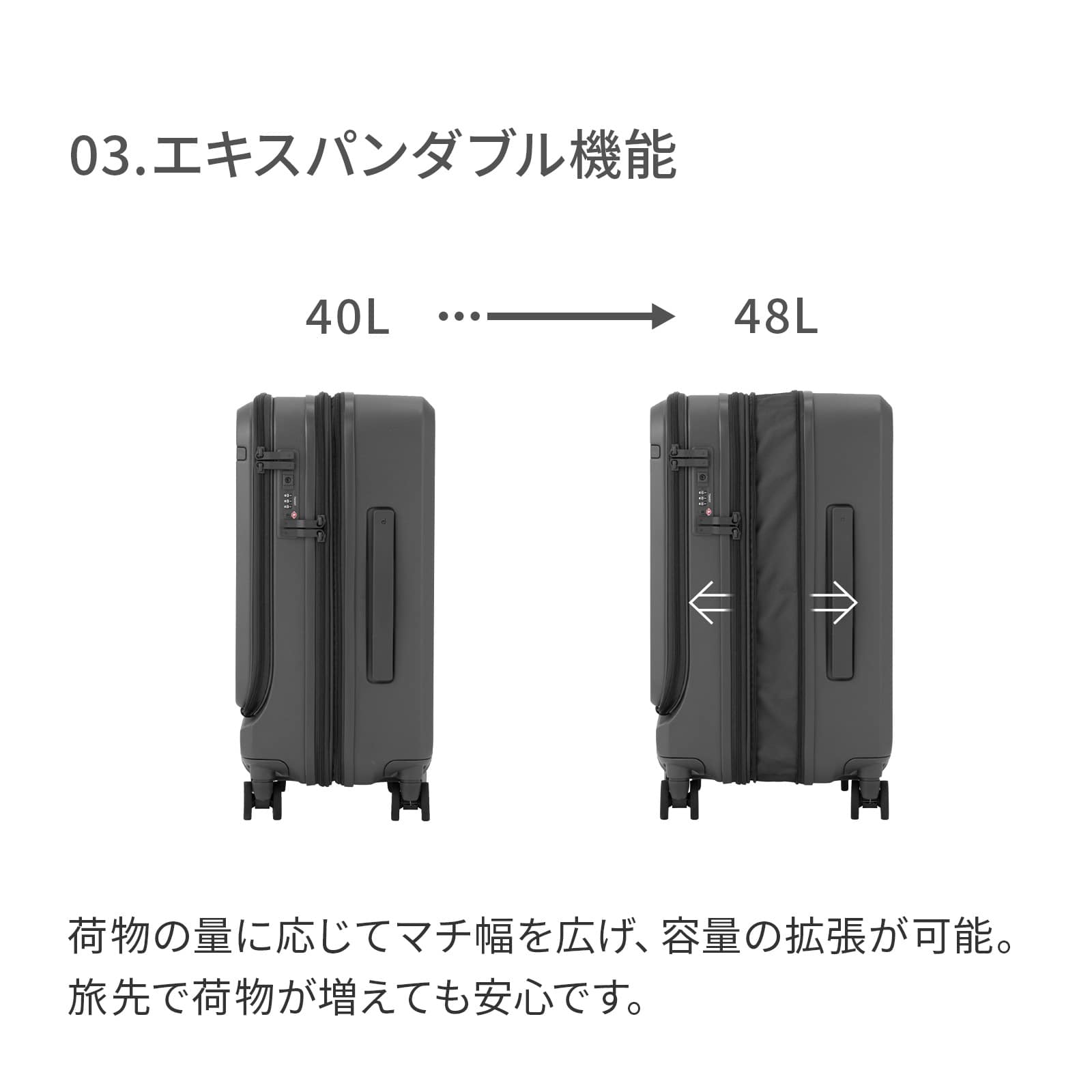 | 商品名 | ace./エース トルク スーツケース 40/48L 機内持ち込み フロントポケット キャスターストッパー 09091 |
