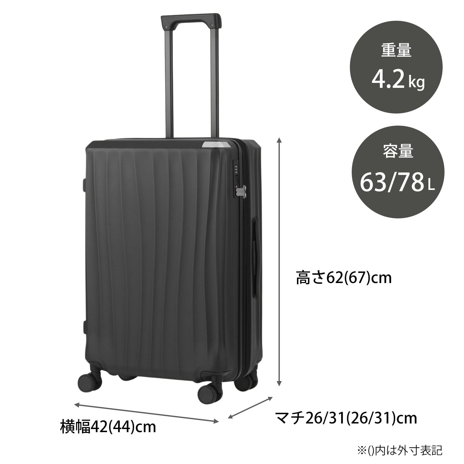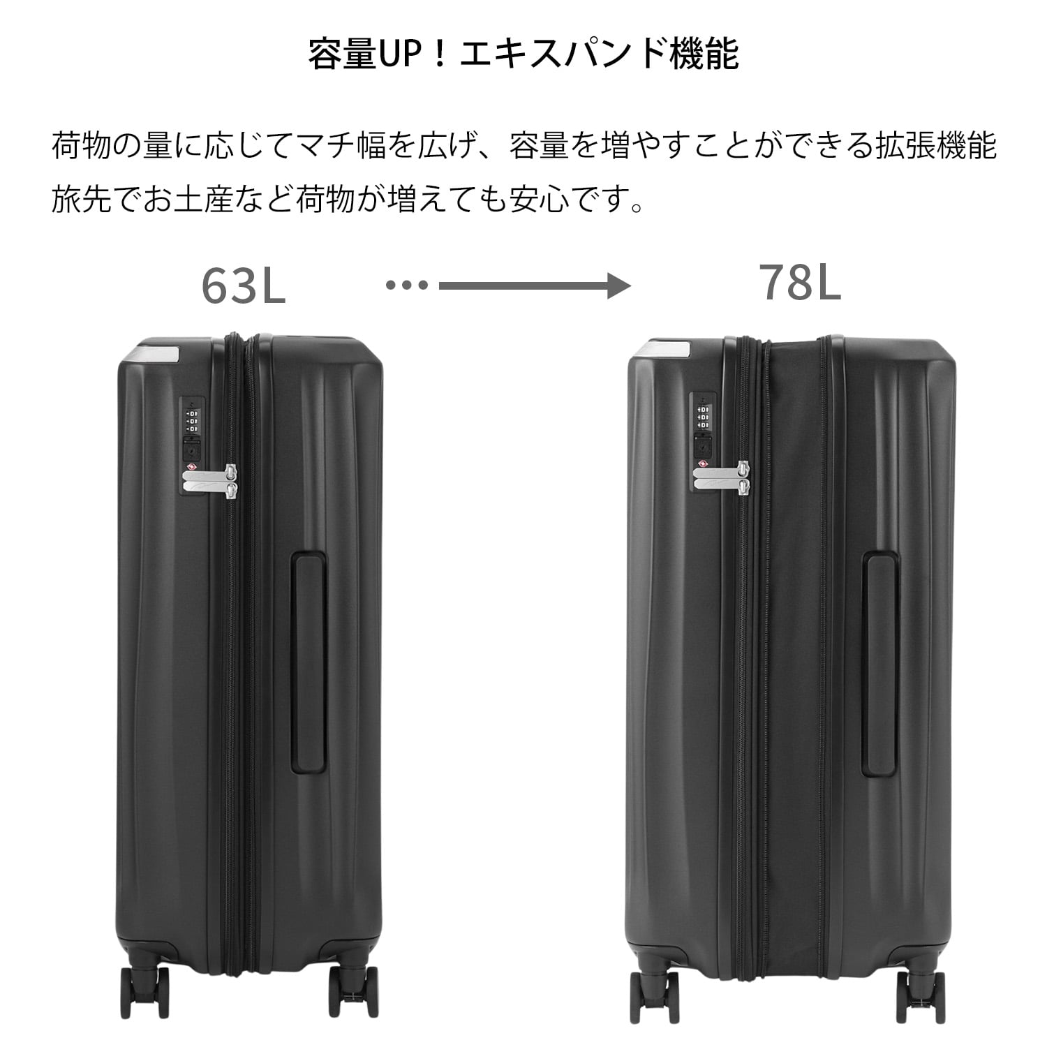 | 機能一覧 | 4輪/TSダイヤルファスナーロック/キャスターストッパー/エキスパンド機能 |