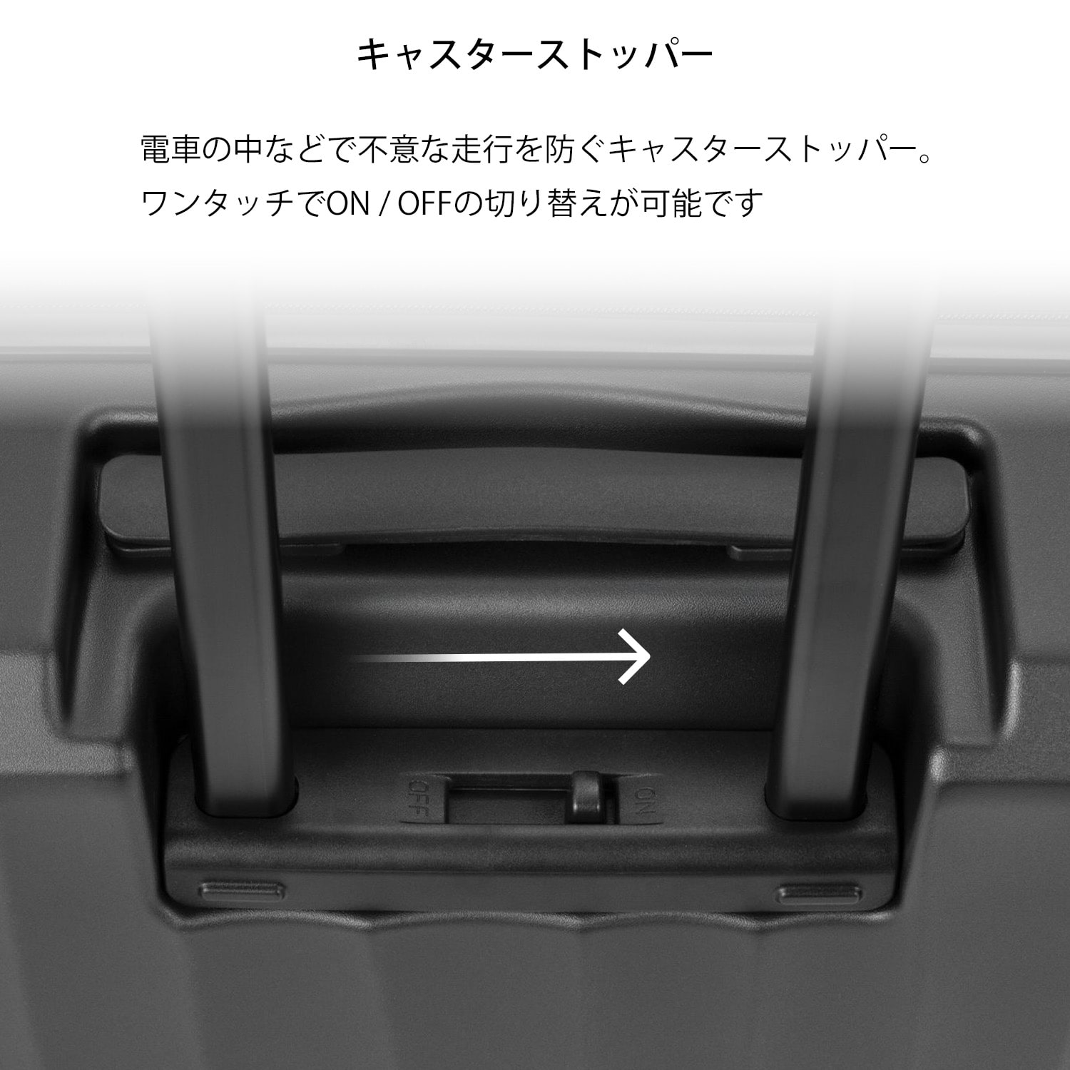 電車での移動などで、手を離しても転がらない便利なストッパー付き。