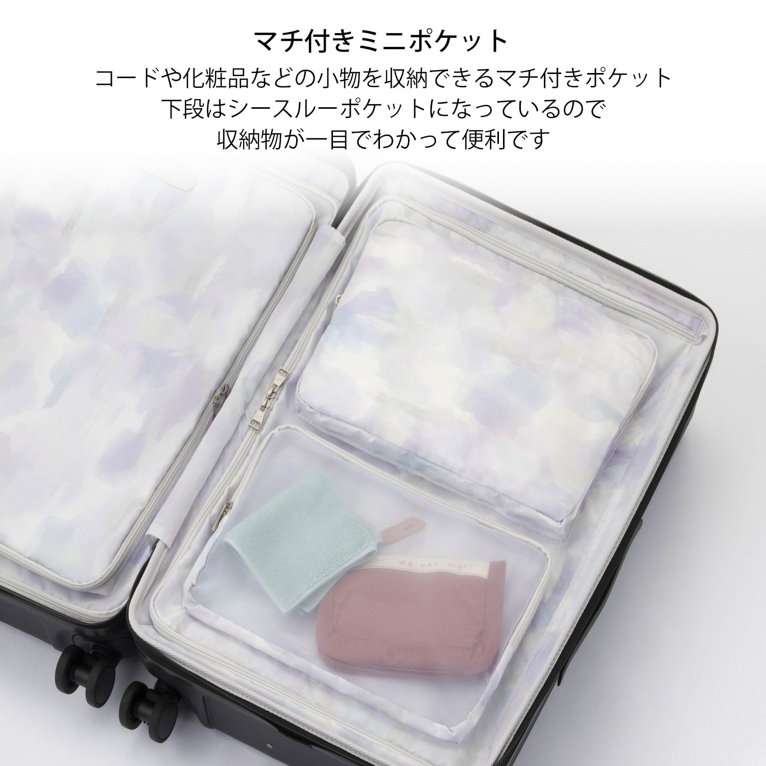 内側にはシースルーポケット×2を備え、小物の整理にも便利です。