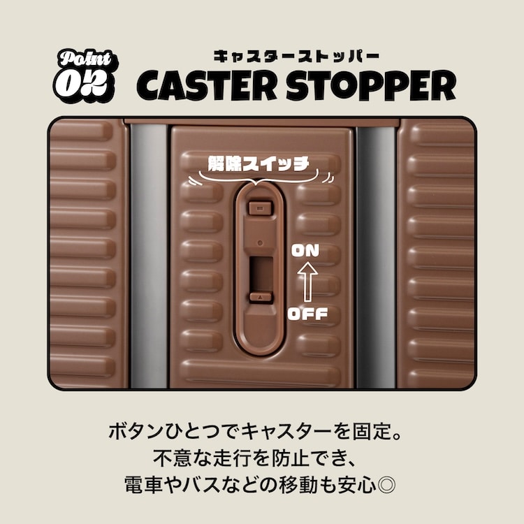電車やバス、傾斜などで不意な走行を防ぐキャスターストッパーを搭載。
