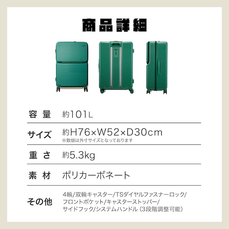 | サイズ | H76×W52×D30 cm ※キャスター・ハンドルを含む外寸表記です。 |