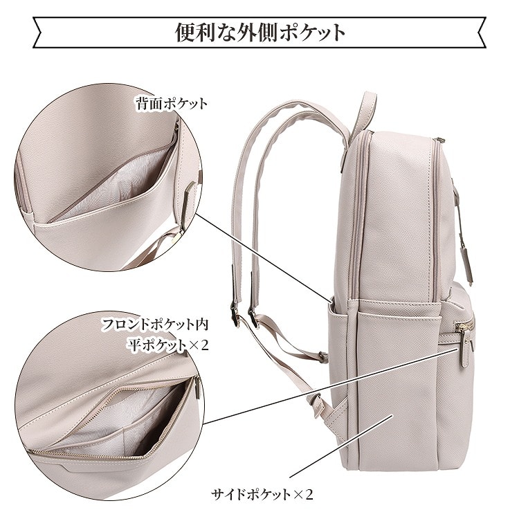 外側には背面ポケット、サイドポケット、フロントポケット(平ポケット×2)が付いており、すぐに取り出したいアイテムを入れるのに便利です。