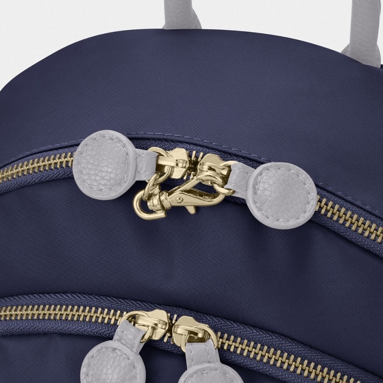 ベルトをつかんで引くと開けやすく、メタル引き手を引くと閉めやすいユニバーサルデザインのフロントポケット。