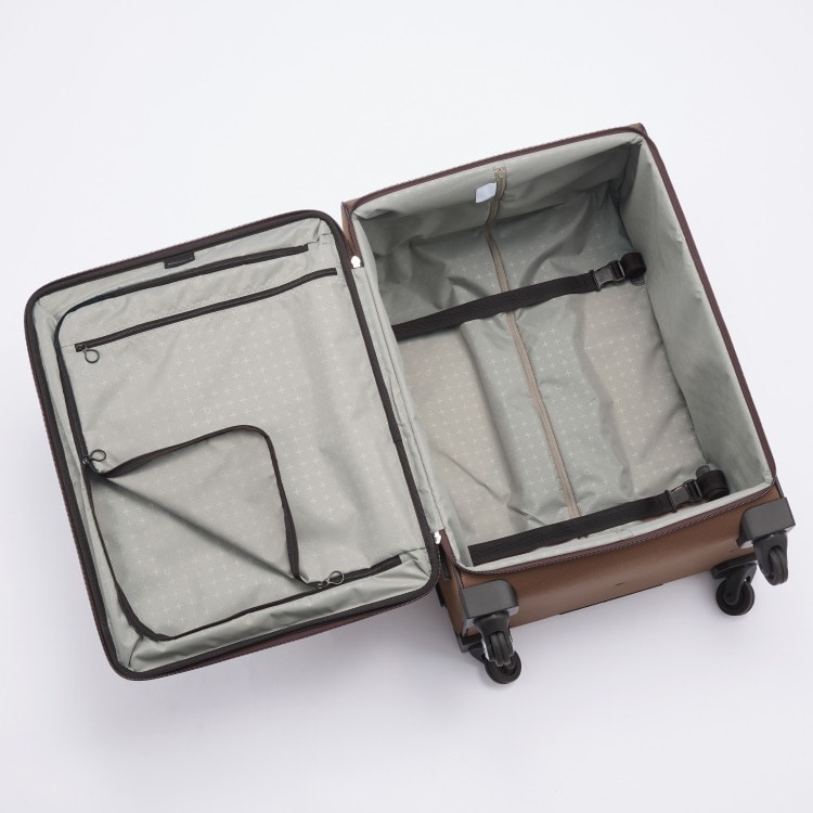 2分割で収納するスーツケースタイプと異なり奥行の深さをフルに使えるので、かさばる荷物もしっかり収納できます。内装には荷物を固定するベルトのほか、フタ側の大型ポケットは小物類の収納に役立ちます。