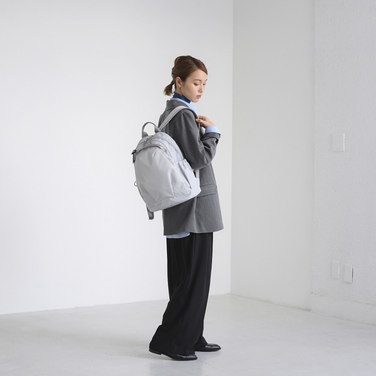 カジュアルなシルエットでも、半光沢感のあるナイロンツイル素材と同色でまとめたデザインで、きれいめコーデのアクセントとしてもオシャレに持てます。