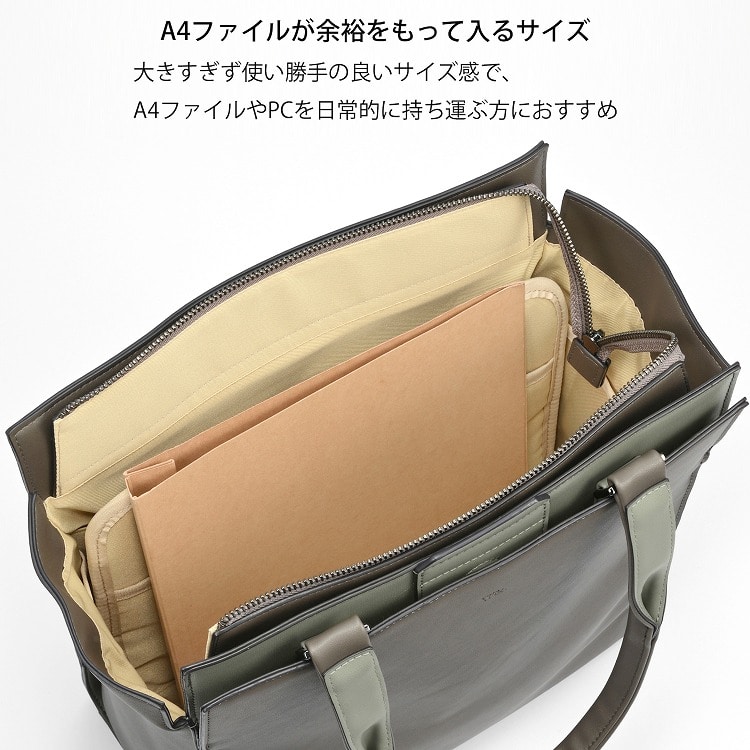 大きすぎず使い勝手の良いサイズ感で、A4ファイルやPCを日常的に持ち運ぶ方におすすめ。