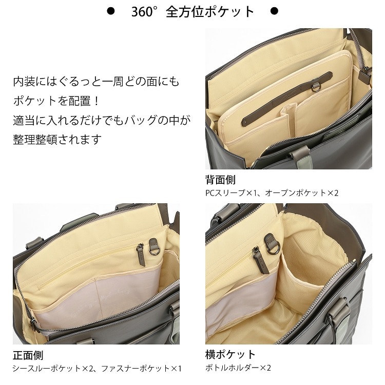 | 機能一覧 | A4ファイル収納/PC収納(13.3inch)/シースルーポケット/他ポケット多数/Napping pl.(スマートフォンポケット)/Me Strap(キーストラップ)/ミニポーチ付属 |