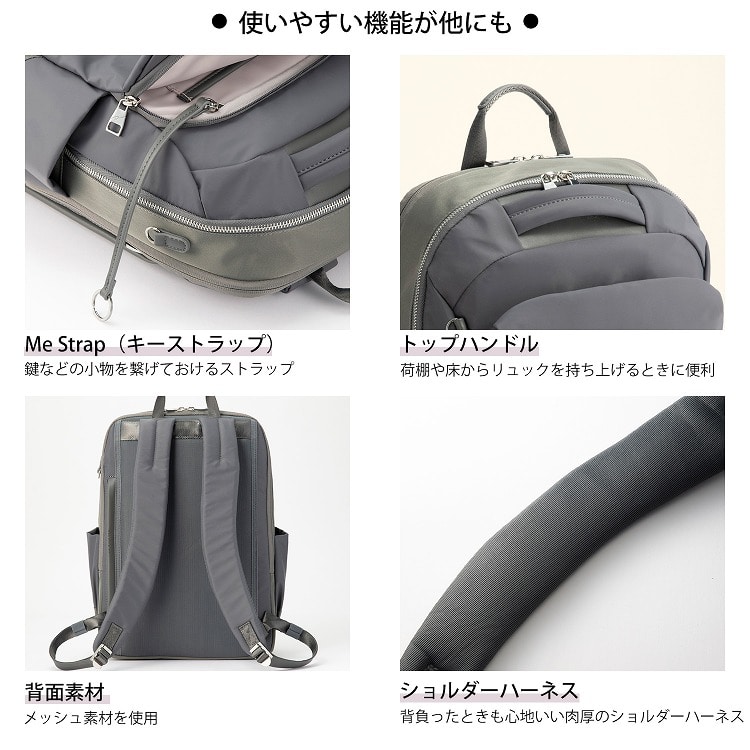 | 機能一覧 | 2気室/A4ファイル収納/PC収納(14.0inch)/シースルーポケット/他ポケット多数/Napping pl.(スマートフォンポケット)/Me Strap(キーストラップ)/背面メッシュ素材 |