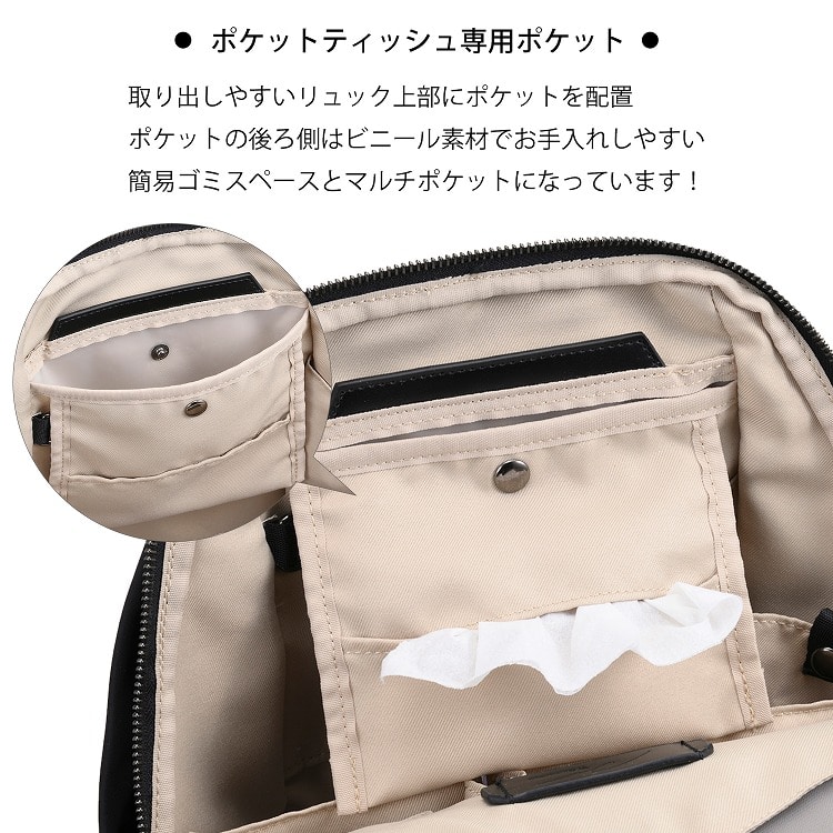 ティッシュの向こう側にはビニール素材でお手入れ可能な簡易ゴミスペースとマルチポケットつき。