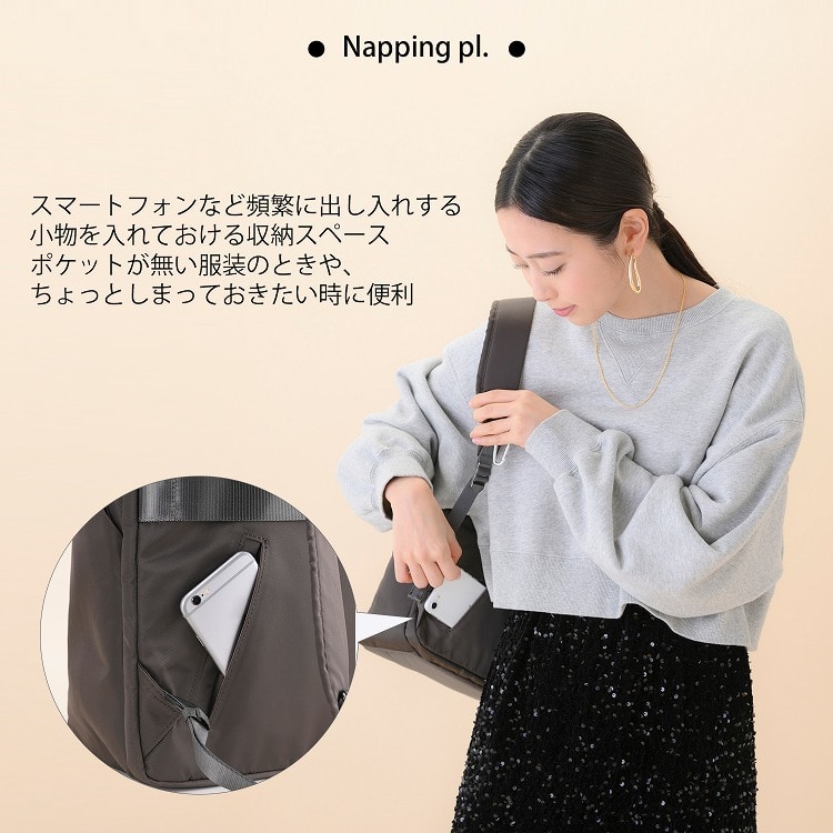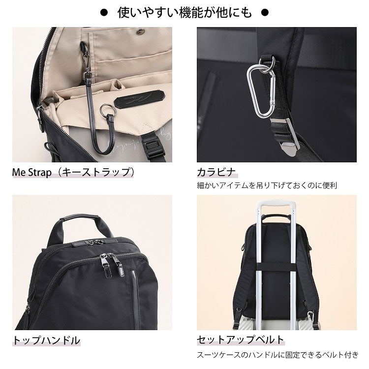 | 機能一覧 | 2気室/A4ファイル収納/PC収納(13.3inch)/ティッシュポケット/シースルーポケット/他ポケット多数/Napping pl.(スマートフォンポケット)/Me Strap(キーストラップ)/セットアップベルト/ポシェット付属 |