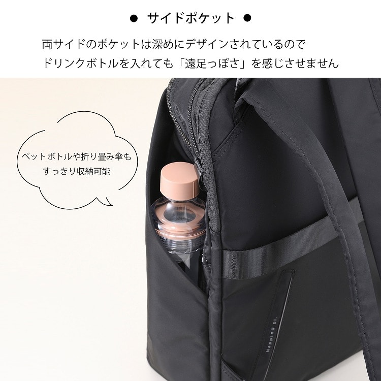 ペットボトルや折り畳み傘を収納可能。深めにデザインされているのでドリンクボトルを入れていても「遠足っぽさ」を感じさせません。