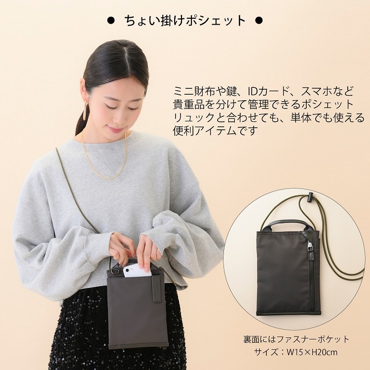 「リュックは中身を取り出しにくい」という先入観とは、もうサヨウナラ。貴重品を身につけておける付属のポシェットは、トップのファスナーポケットにそのまますっぽり収まるサイズ。