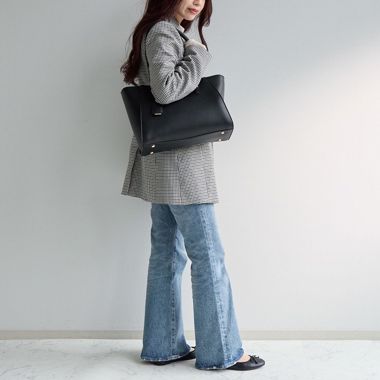 トレンド感のあるロングハンドルがポイントのトートバッグ。