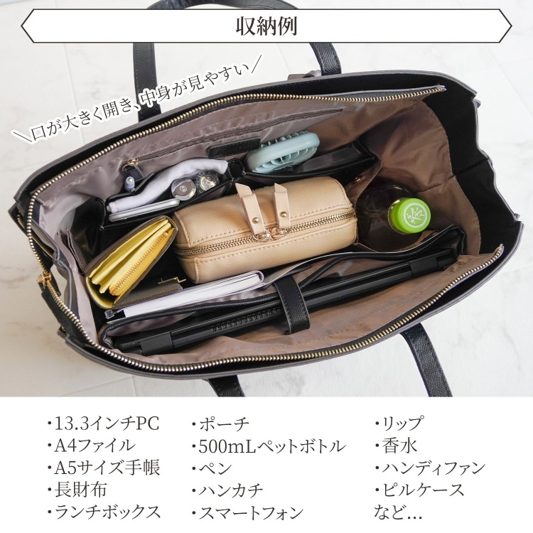 しっかりと自立するマチが広めのキレイめトートバッグ。