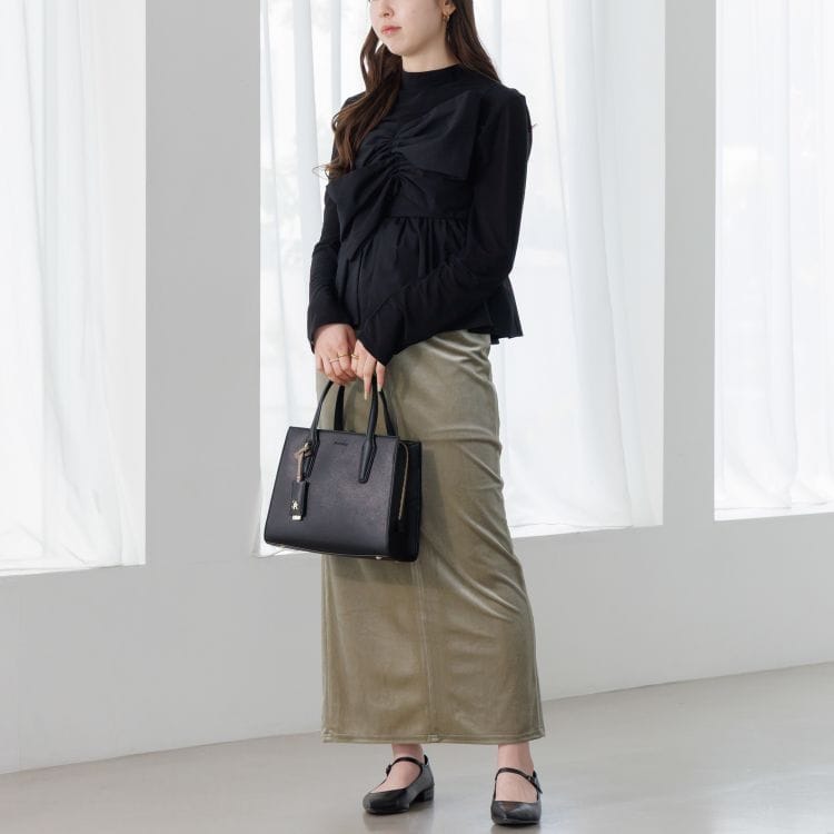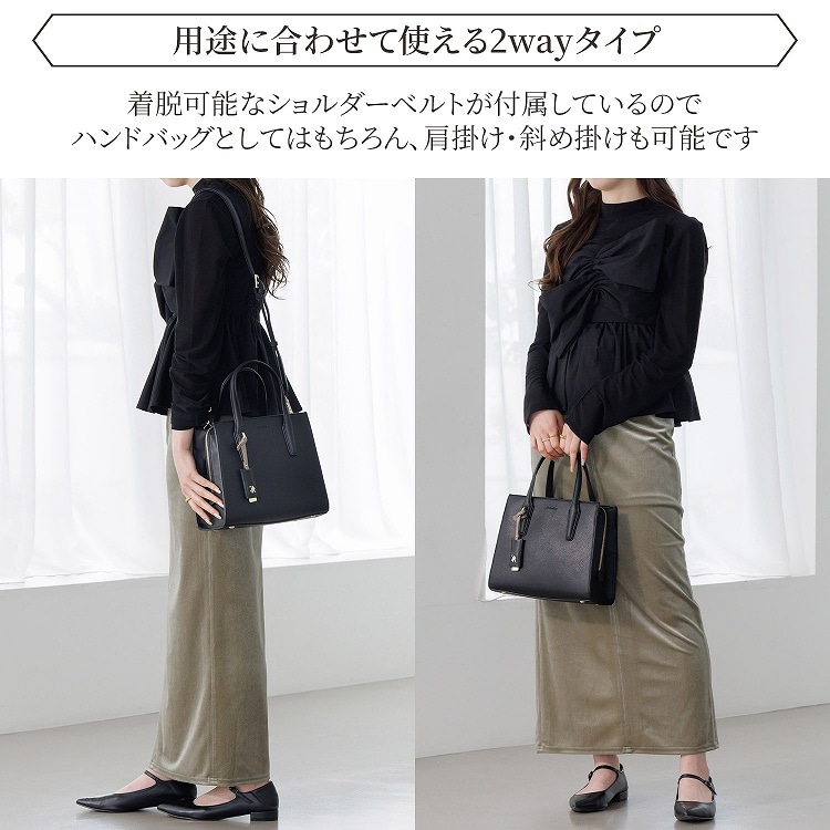 かっちりとしたシルエットで、通勤にもおすすめなスクエアハンドバッグ。