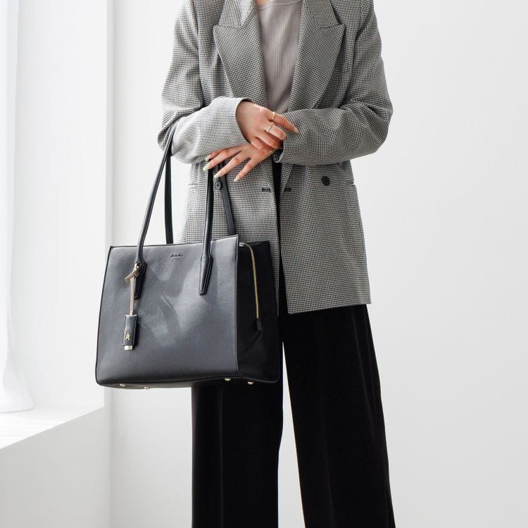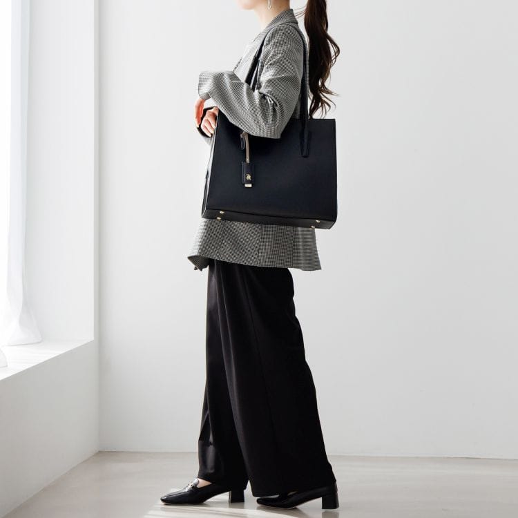 かっちりとしたシルエットで、通勤にもおすすめなスクエアハンドバッグ。