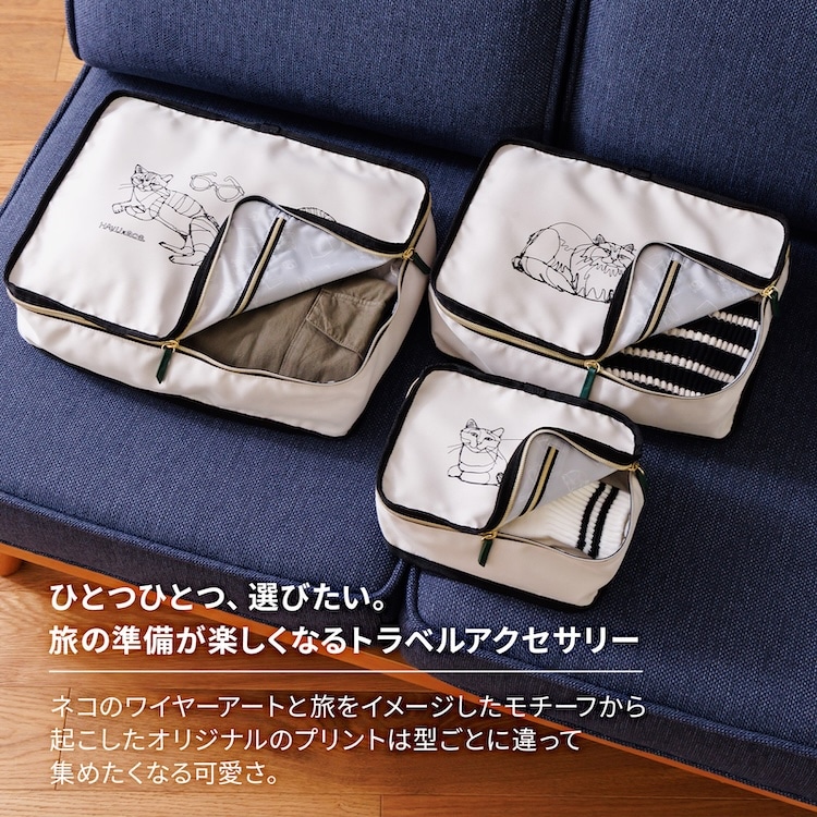 ネコのワイヤーアートと旅をイメージしたモチーフから起こしたオリジナルのプリントは型ごとに違って集めたくなる可愛さ。