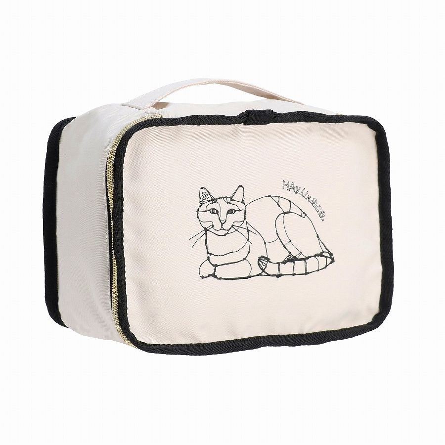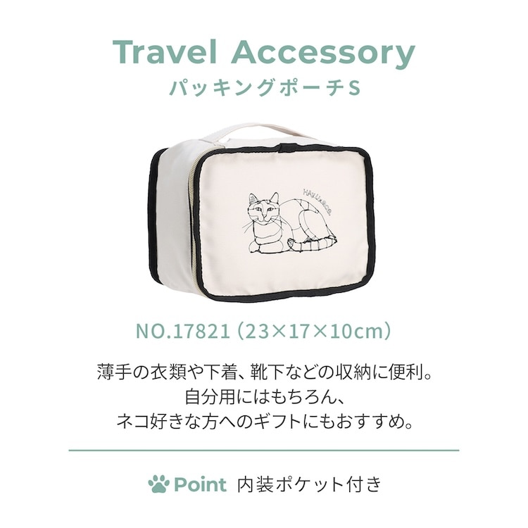 香箱座りのネコがプリントされたパッキングポーチSは、薄手の衣類や下着、靴下などの収納に便利です。