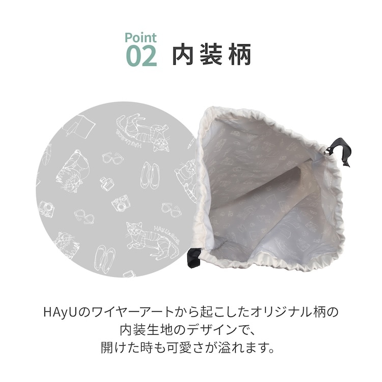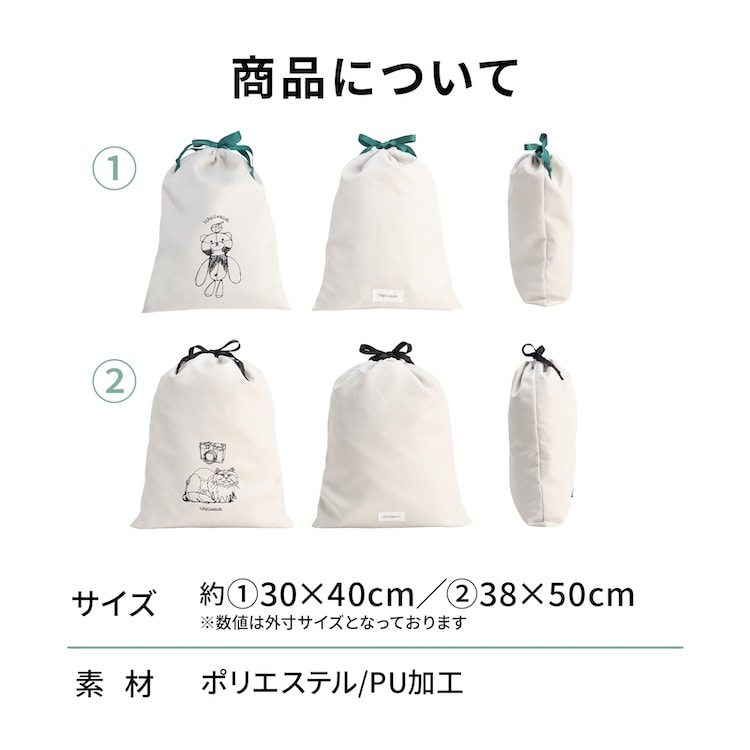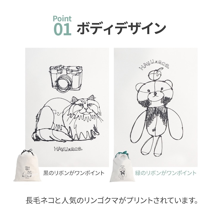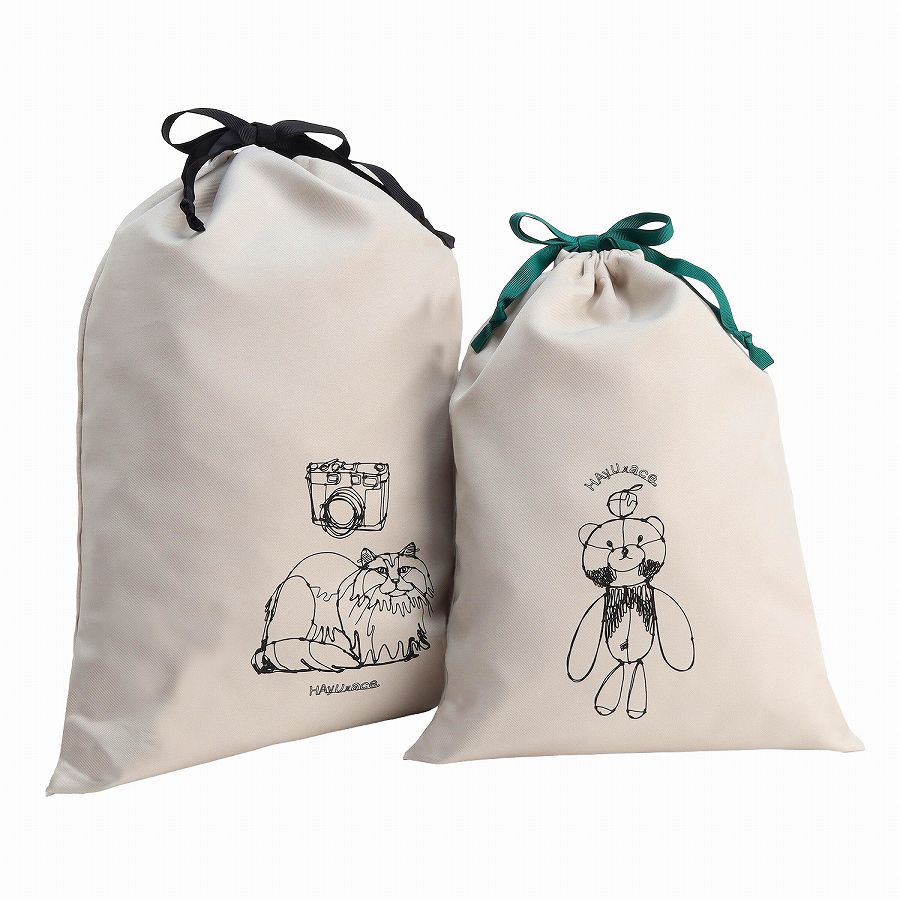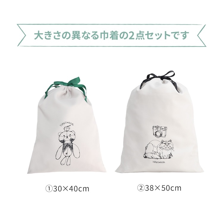 長毛ネコと人気のリンゴクマのプリントが可愛い巾着セット。