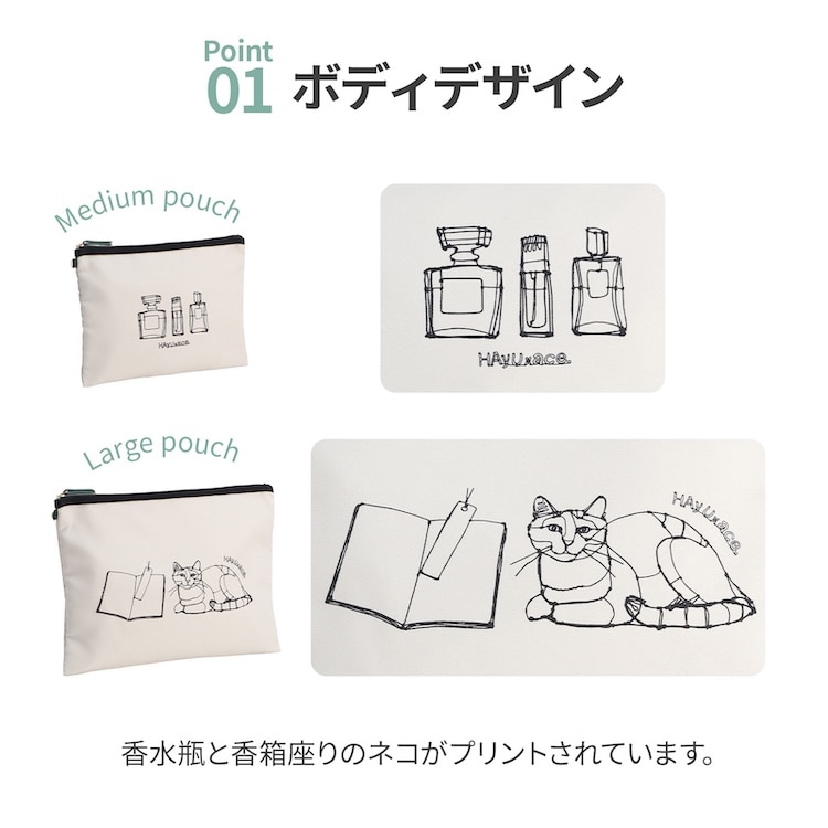 香水瓶と香箱座りのネコのプリントで並べても可愛いフラットポーチの3点セット。