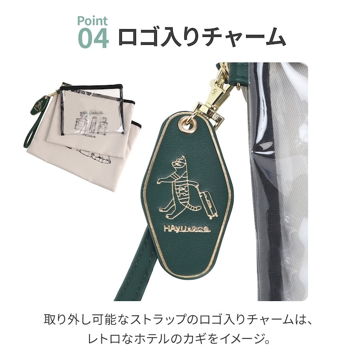 ・取り外し可能なストラップには、レトロなホテルのカギをイメージしたチャーム付き。
