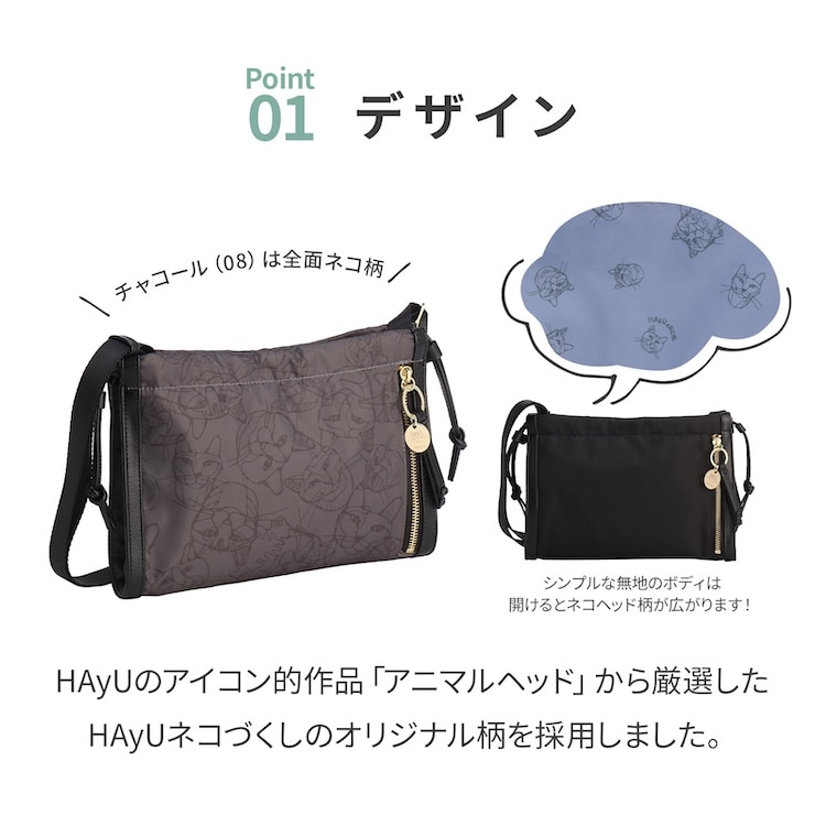 HAyUのアイコン的作品「アニマルヘッド」から厳選したHAyUネコづくしのオリジナル柄を採用しました。
