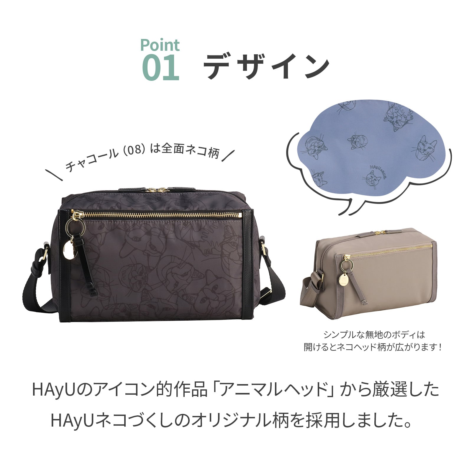 HAyUのアイコン的作品「アニマルヘッド」から厳選したHAyUネコづくしのオリジナル柄を採用しました。