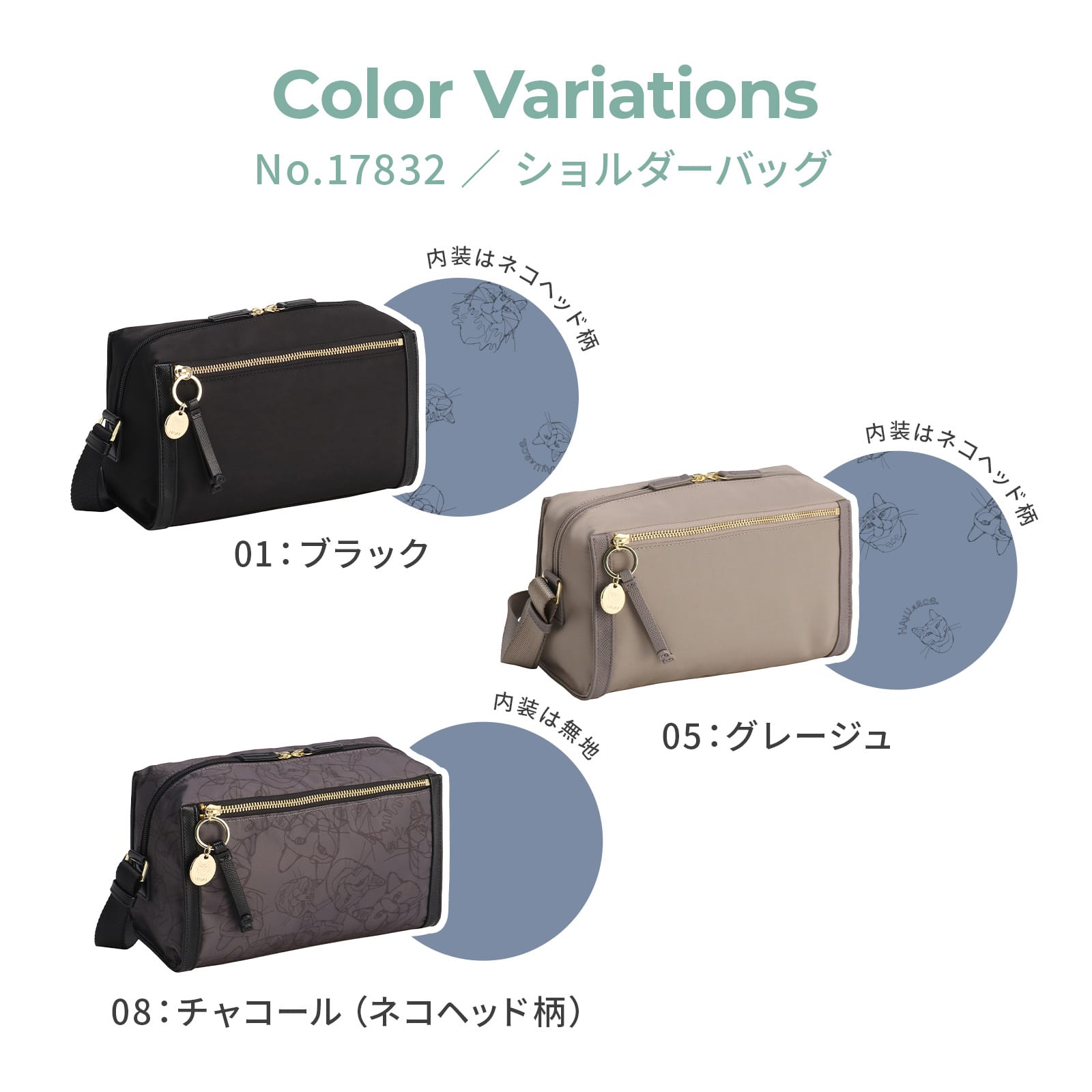 ・シンプルな無地タイプは内装ネコ柄、ネコヘッド柄タイプは内装無地仕様。