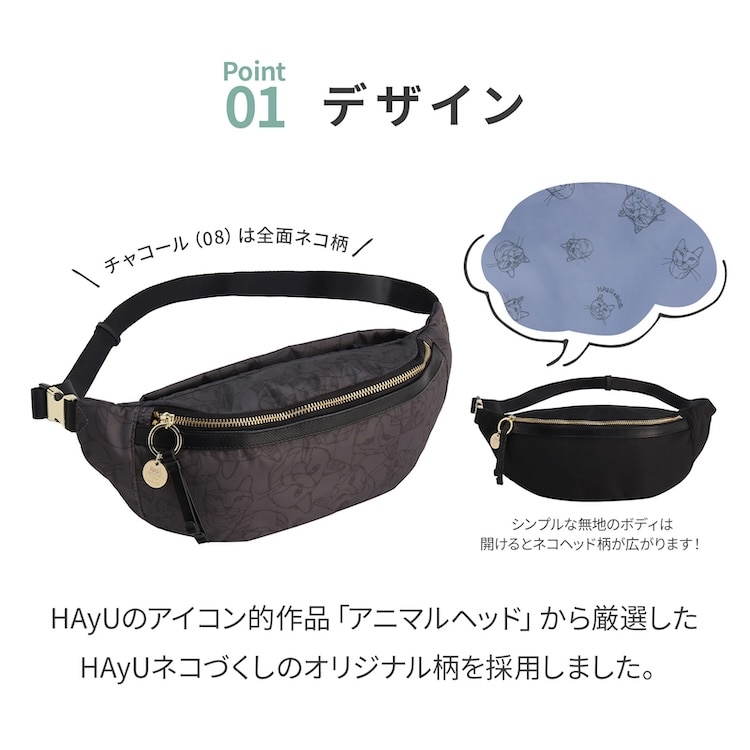HAyUのアイコン的作品「アニマルヘッド」から厳選したHAyUネコづくしのオリジナル柄を採用しました。