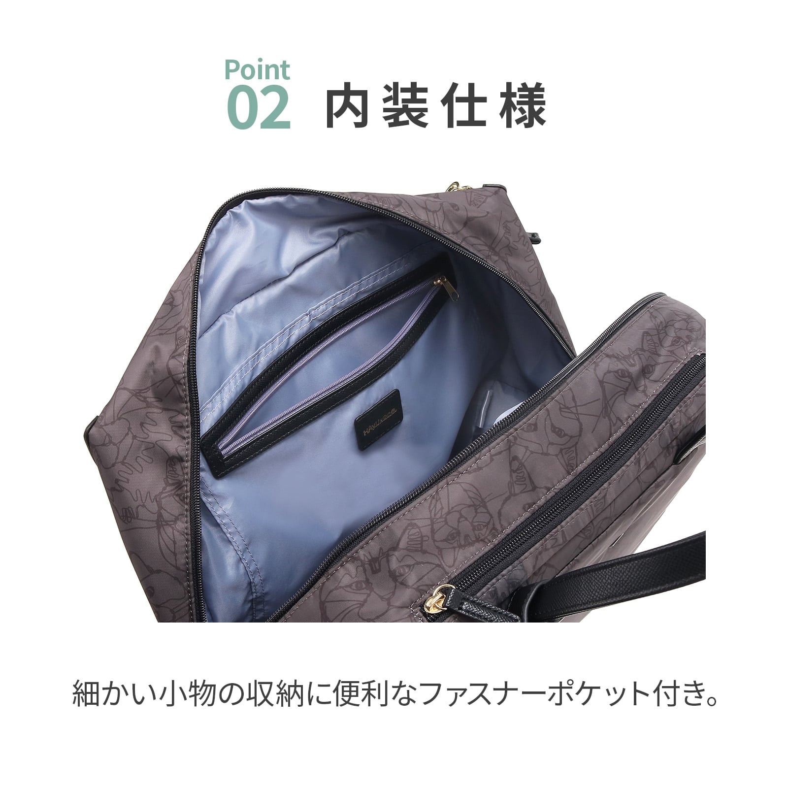 ・シンプルな無地タイプは内装ネコ柄、ネコヘッド柄タイプは内装無地仕様。