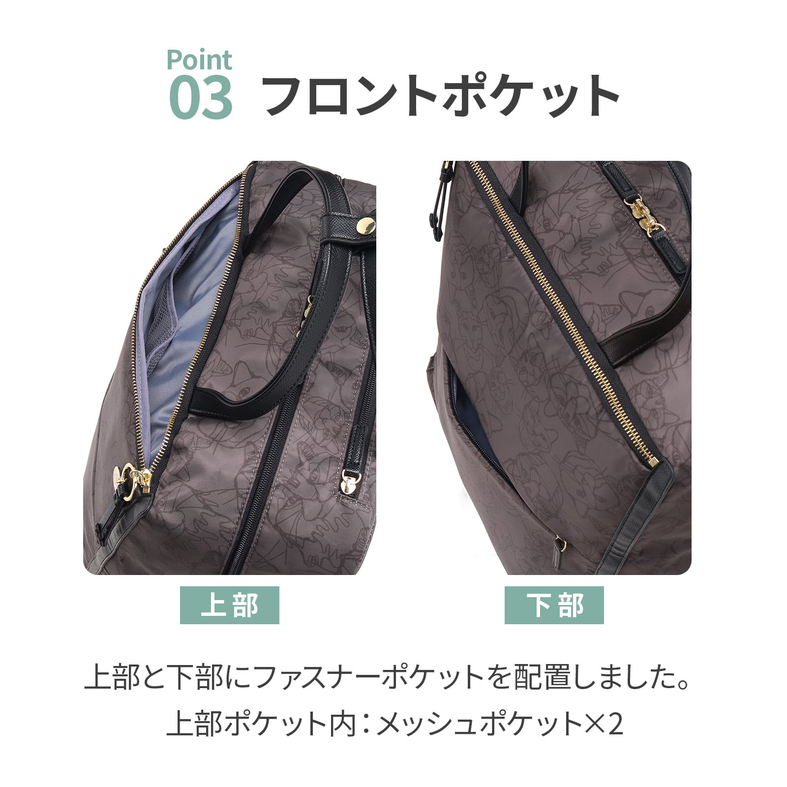 ・フロント上部ファスナーポケット×1(メッシュポケット×2)