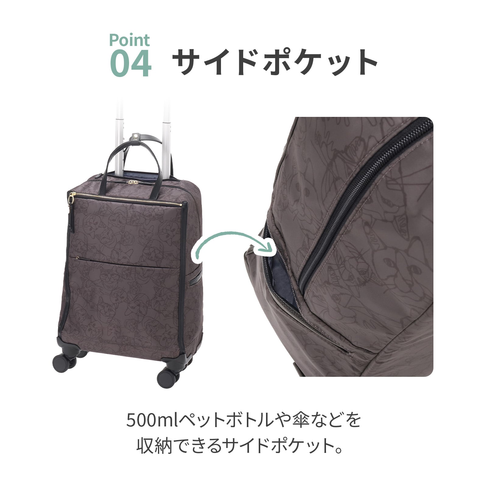 移動中などにさっと出せるフロントポケットや、ボトルや折りたたみ傘の収納に便利な、ボトルホルダーなど使いやすい機能が充実しています。