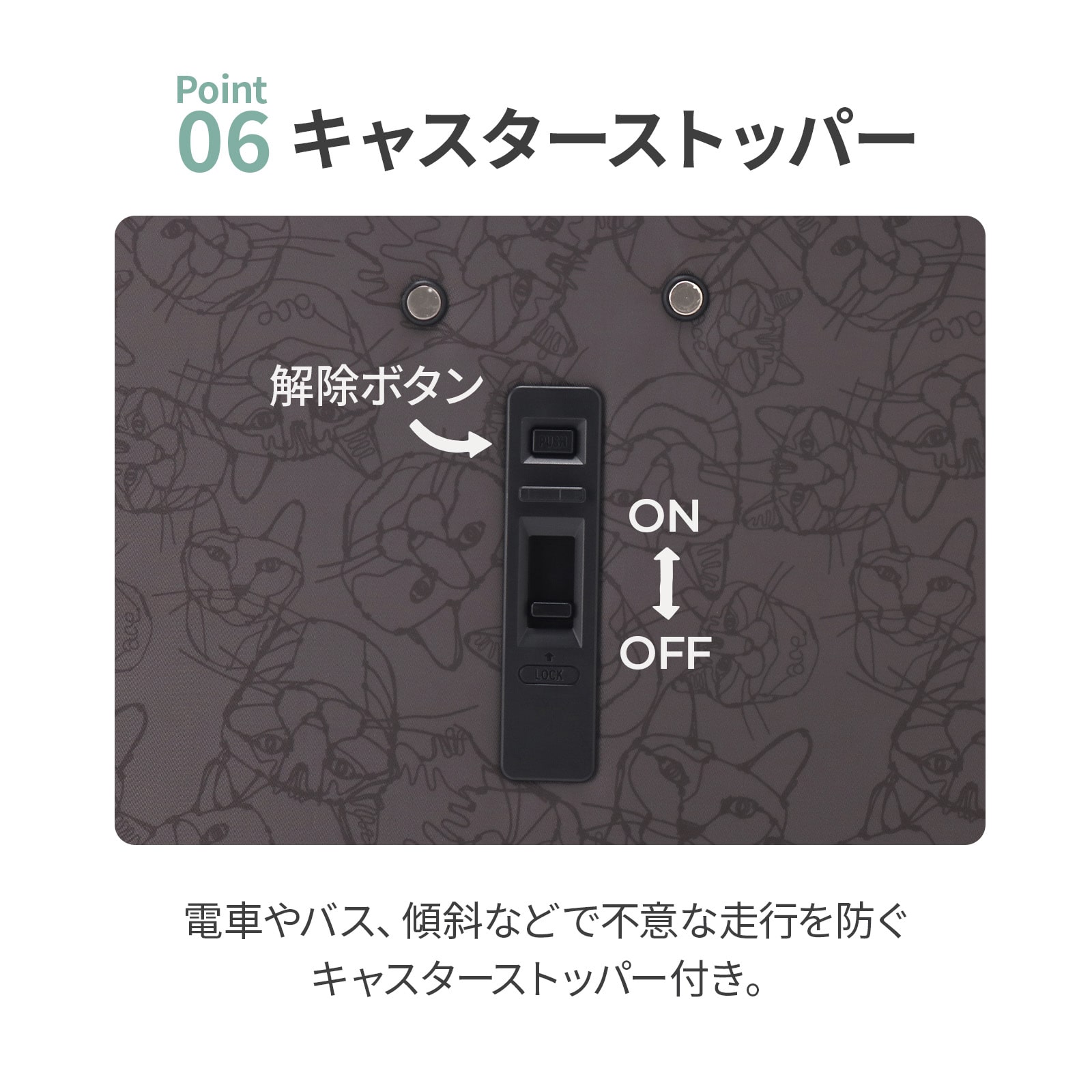 | 機能一覧 | 国内100席以上・機内持込み対応/TS南京錠/キャスターストッパー/静音キャスター |