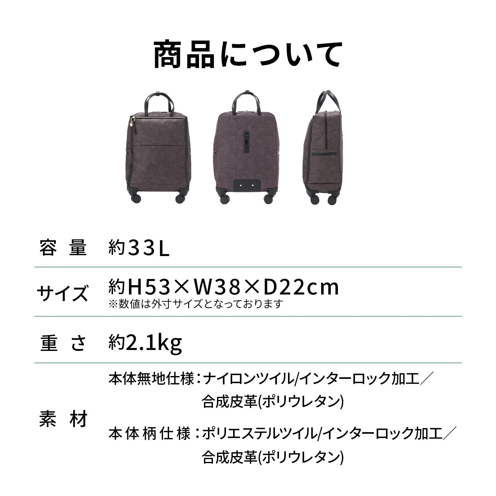 | サイズ | H53×W38×D22cm ※サイズはキャスター・ハンドルを含む外寸表記です。 |