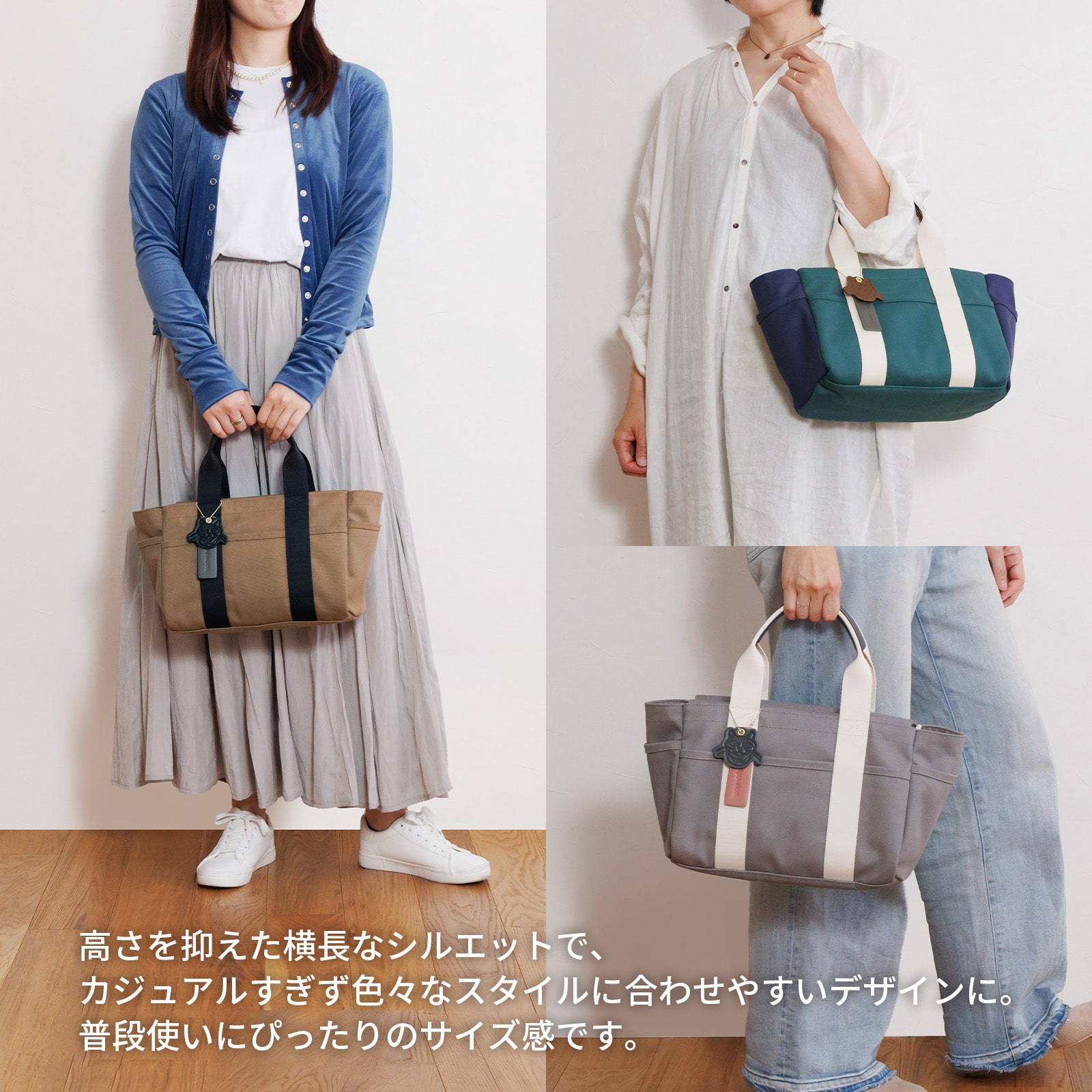 ちょっとした外出にぴったりな小ぶりのトートは、高さを抑えた横長なシルエットで、カジュアルすぎず色々なスタイルに合わせやすいデザインに仕上げました。