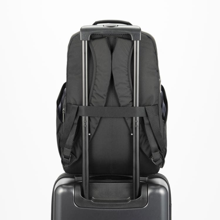 薄暗い場所でも荷物を見つけやすいよう、明るいグレーのストライプ生地をメイン気室、フロントポケットに採用。
